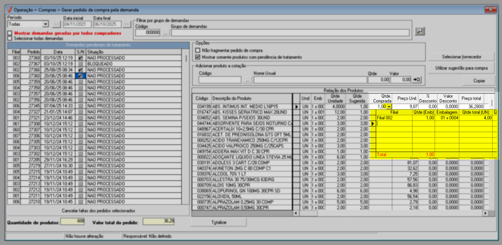 Caso queira incluir esse produto, no pedido de uma demanda que também foi selecionada na seção de demandas pendentes, basta inserir, teclando >>Enter após cada informação, o código da loja correspondente no campo "Filial" e informar a quantidade de embalagens desejadas no campo "Qtde(Emb.)". A seguir, a coluna "Qtde total (Unid)" apresentará a quantidade correspondente.