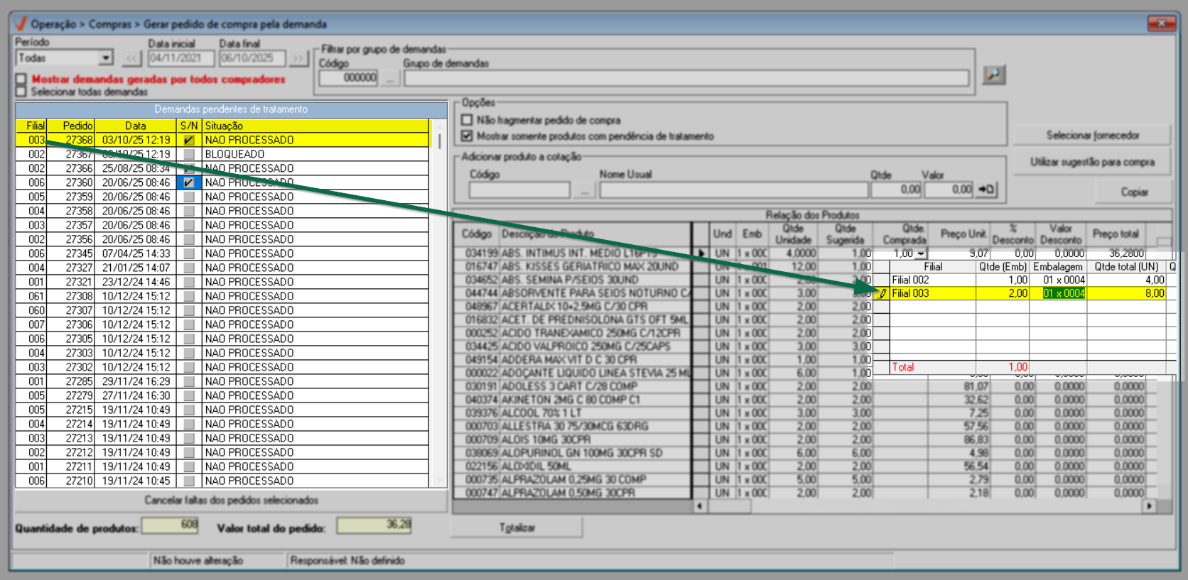 Ao clicar na setinha exibida no campo correspondente ao produto, na coluna "Qtde. Comprada", uma pequena janela será aberta. Nela, é possível visualizar informações detalhadas sobre a filial relacionada à demanda do produto selecionado, bem como a quantidade de embalagens solicitadas e o número de unidades por embalagem.