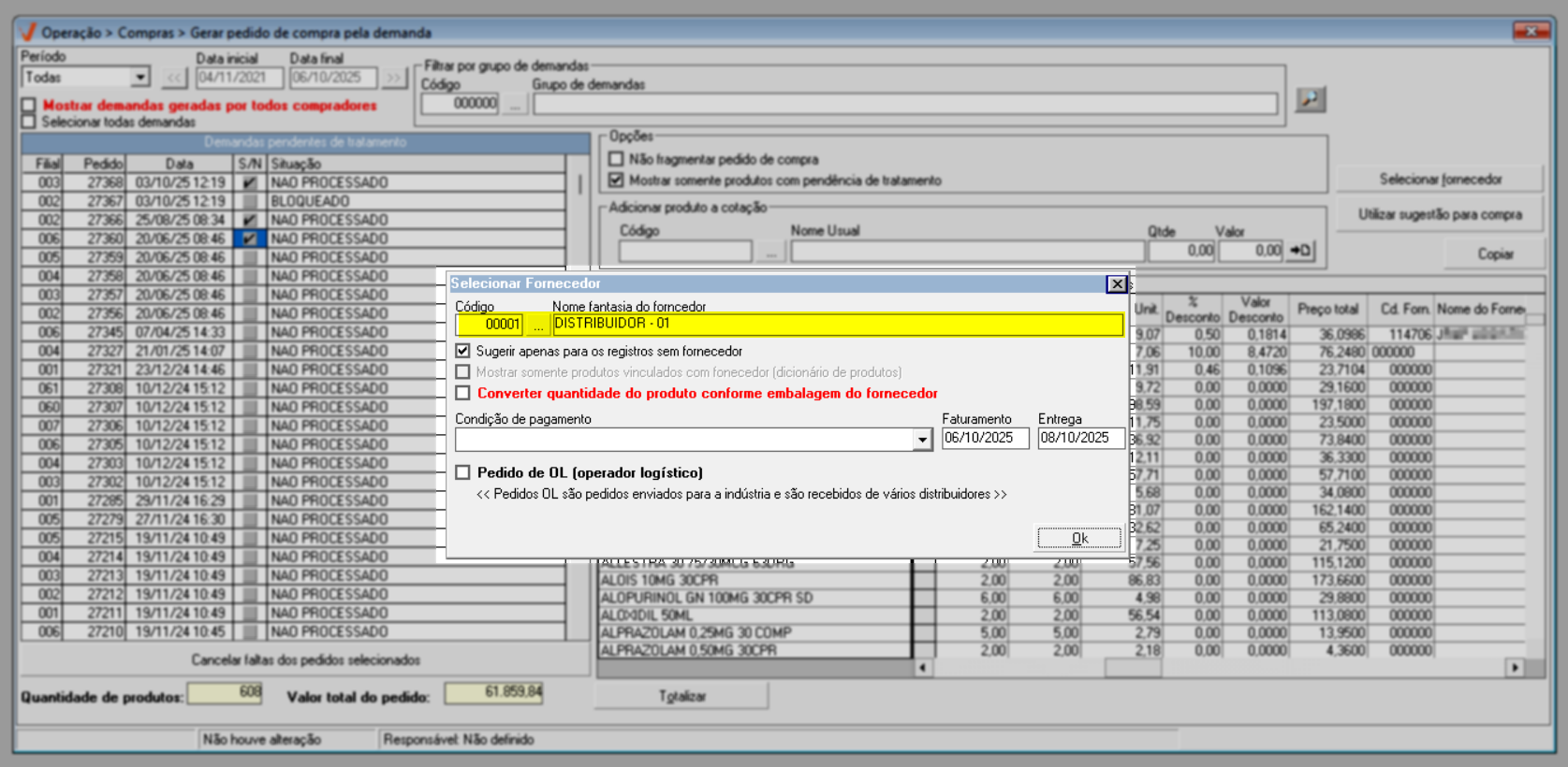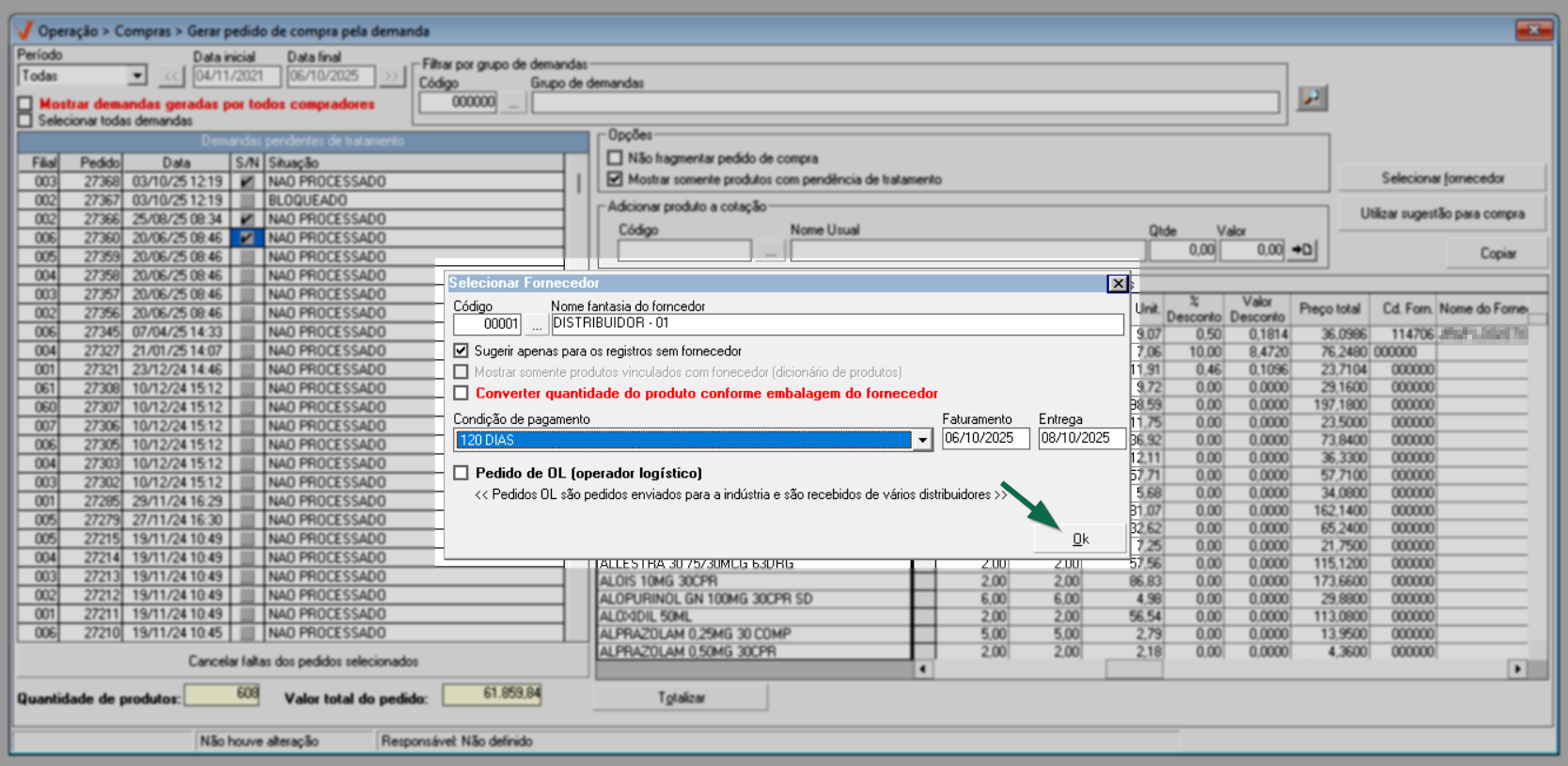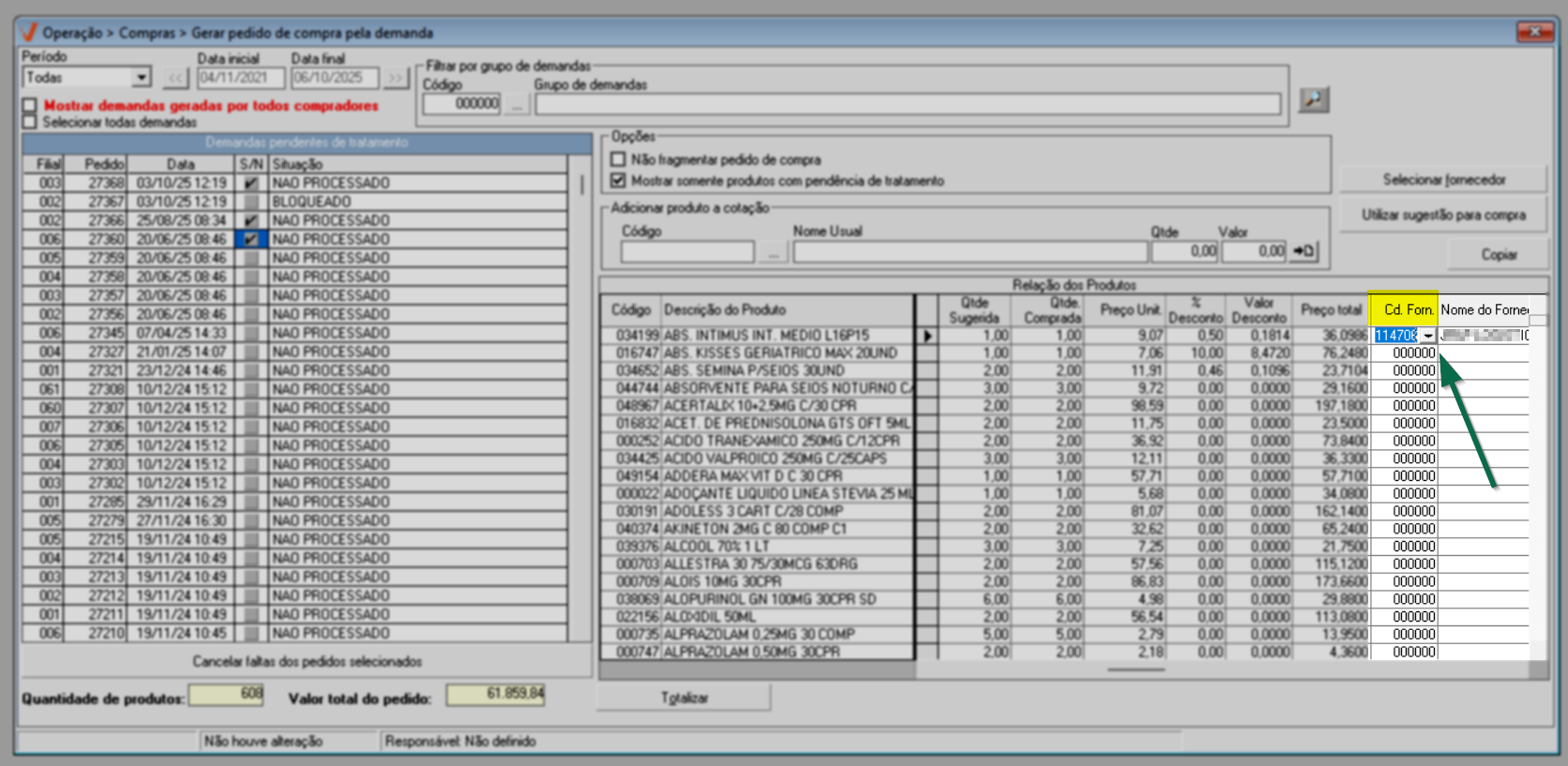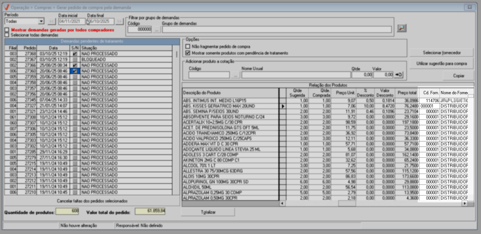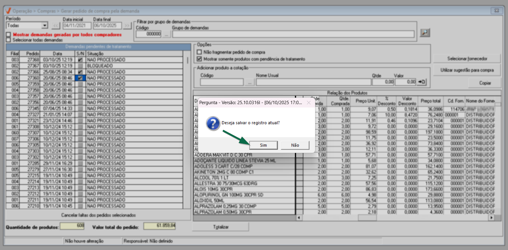 Após identificar os fornecedores de todos os pedidos, pressione o atalho >> F2 para salvar e confirmar a operação.