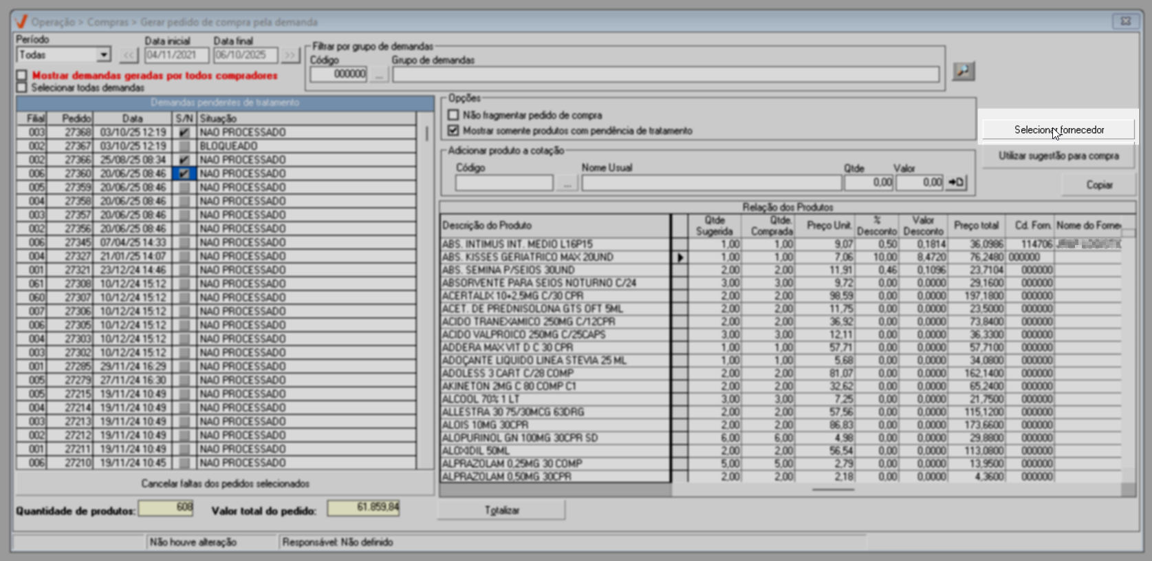 Quando desejado, é possível atribuir o mesmo fornecedor para todos os produtos da lista, que ainda não possuam um fornecedor informado. Para isso, clique no botão "Selecionar Fornecedor".