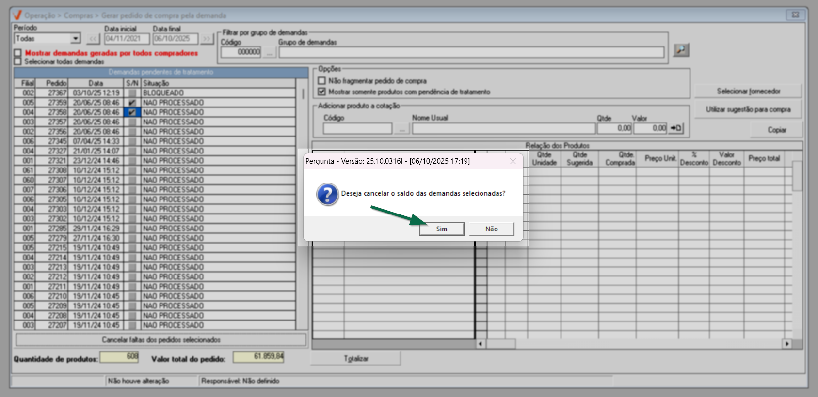 Em seguida, será exibida a mensagem de confirmação: "Deseja cancelar o saldo das demandas selecionadas?". Clique em "Sim" para confirmar. Assim, a demanda será excluída da lista de demandas pendentes de tratamento.
