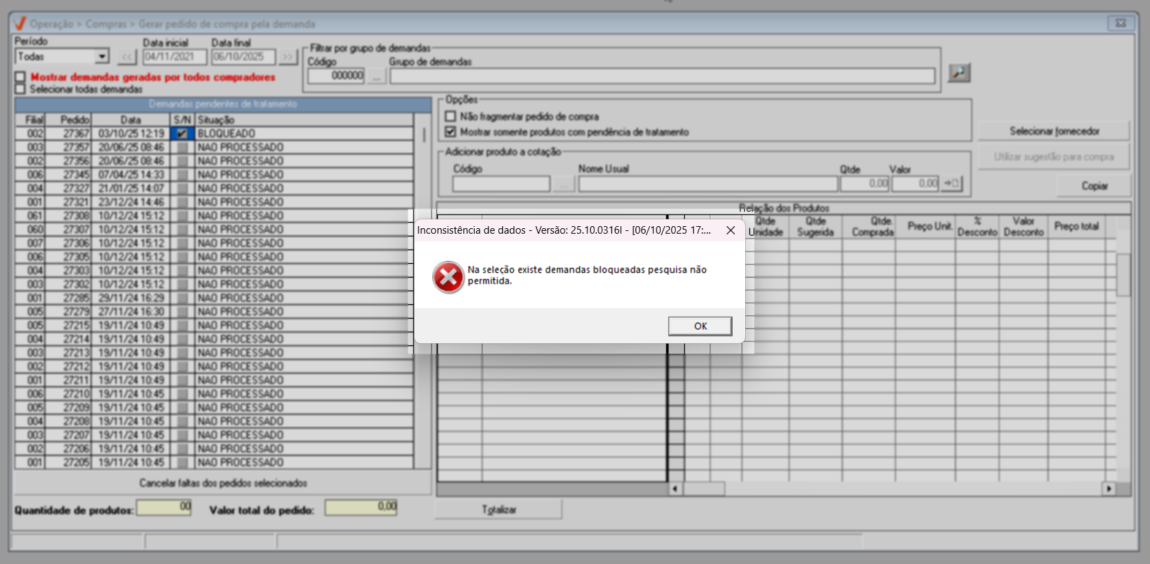 Se na relação de demandas pendentes de tratamento houver demandas com a situação "Bloqueado", elas não poderão ser selecionadas para geração de pedido de compra. Se uma demanda bloqueada for selecionada, ao tentar prosseguir com a operação teclando F6 para buscar os produtos associados, uma mensagem de alerta será exibida na tela indicando que "Na seleção existe demandas bloqueadas, pesquisa não permitida". Nesses casos, um usuário autorizado, deverá realizar o desbloqueio, para que seja possível continuar com a geração da demanda. Clique aqui e aprenda como realizar esse desbloqueio.