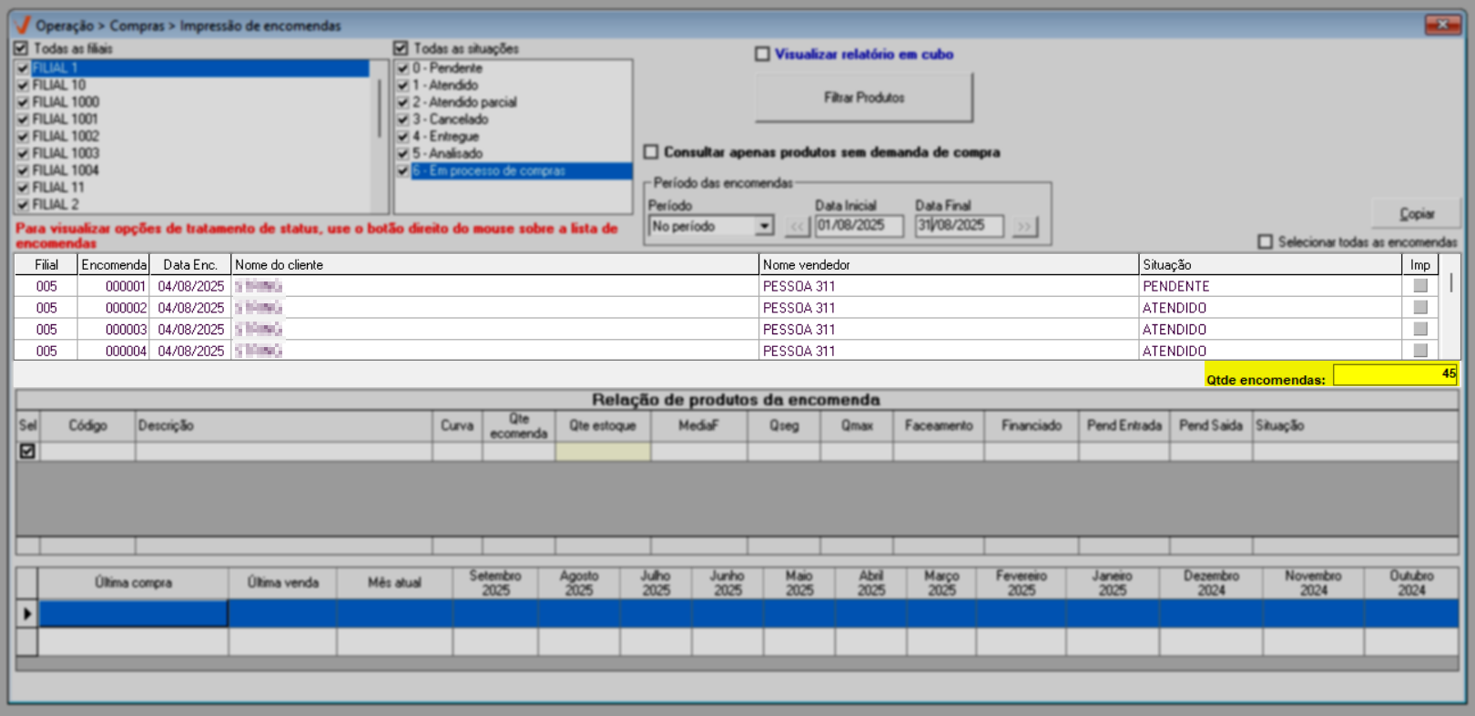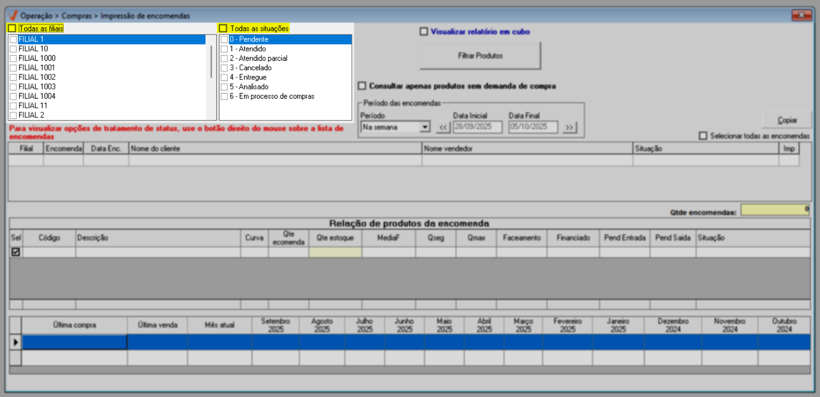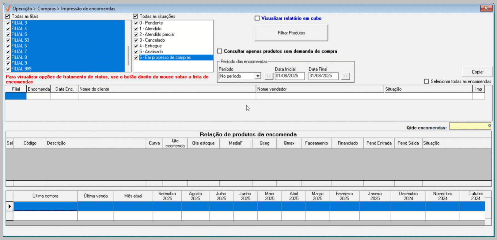 É essencial que as encomendas estejam previamente registradas no módulo Orçamento. Somente após esse registro, será possível aplicar as ações de consulta, impressão, exclusão e/ou alteração de status das encomendas.