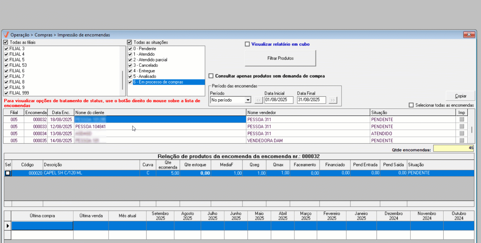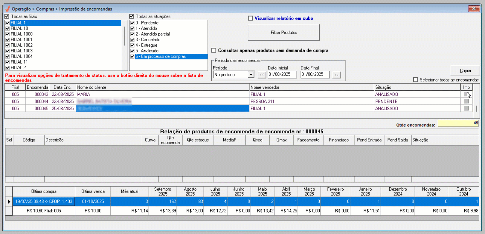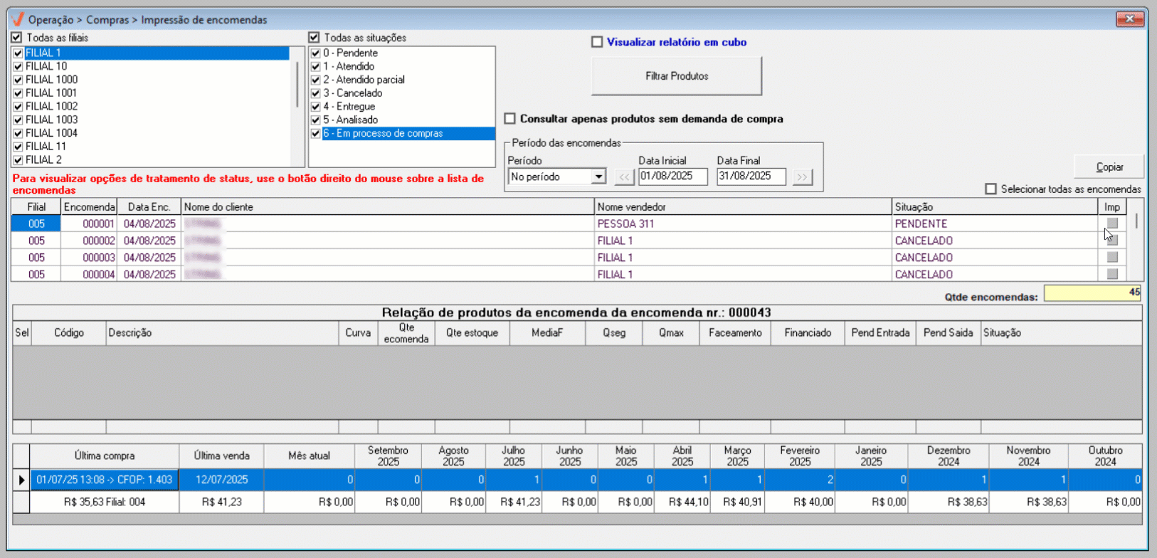 É essencial que as encomendas estejam previamente registradas no módulo Orçamento. Somente após esse registro, será possível aplicar as ações de consulta, impressão, exclusão e/ou alteração de status das encomendas.