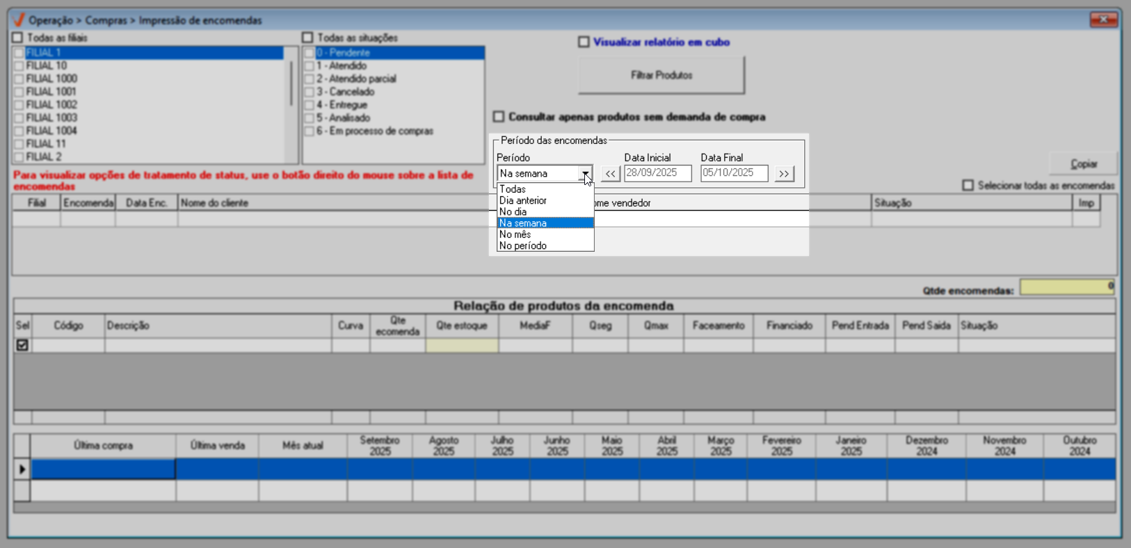 Continuando, utilize a seção "Período de encomendas" e indique um período de referência para a consulta dos registros. O sistema sugere a pesquisa por semana, contudo, poderá selecionar o parâmetro que desejar e conforme o critério indicado. Clique aqui caso queira saber mais sobre essa funcionalidade.