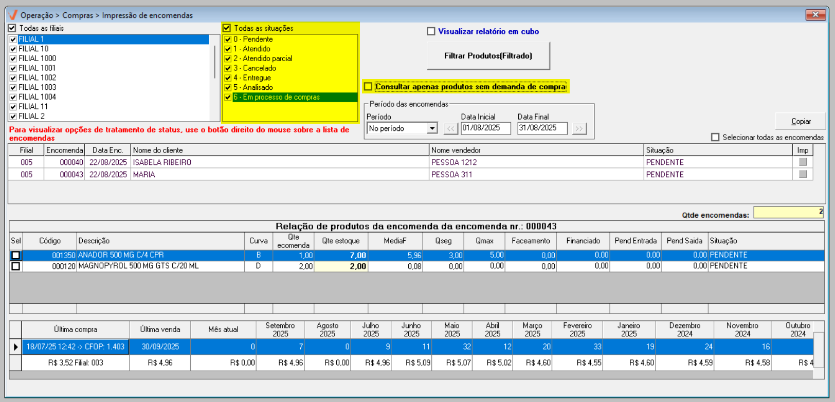 - Pendente: Encomendas que ainda não foram atendidas, isto é, aguardam retorno dos fornecedores.