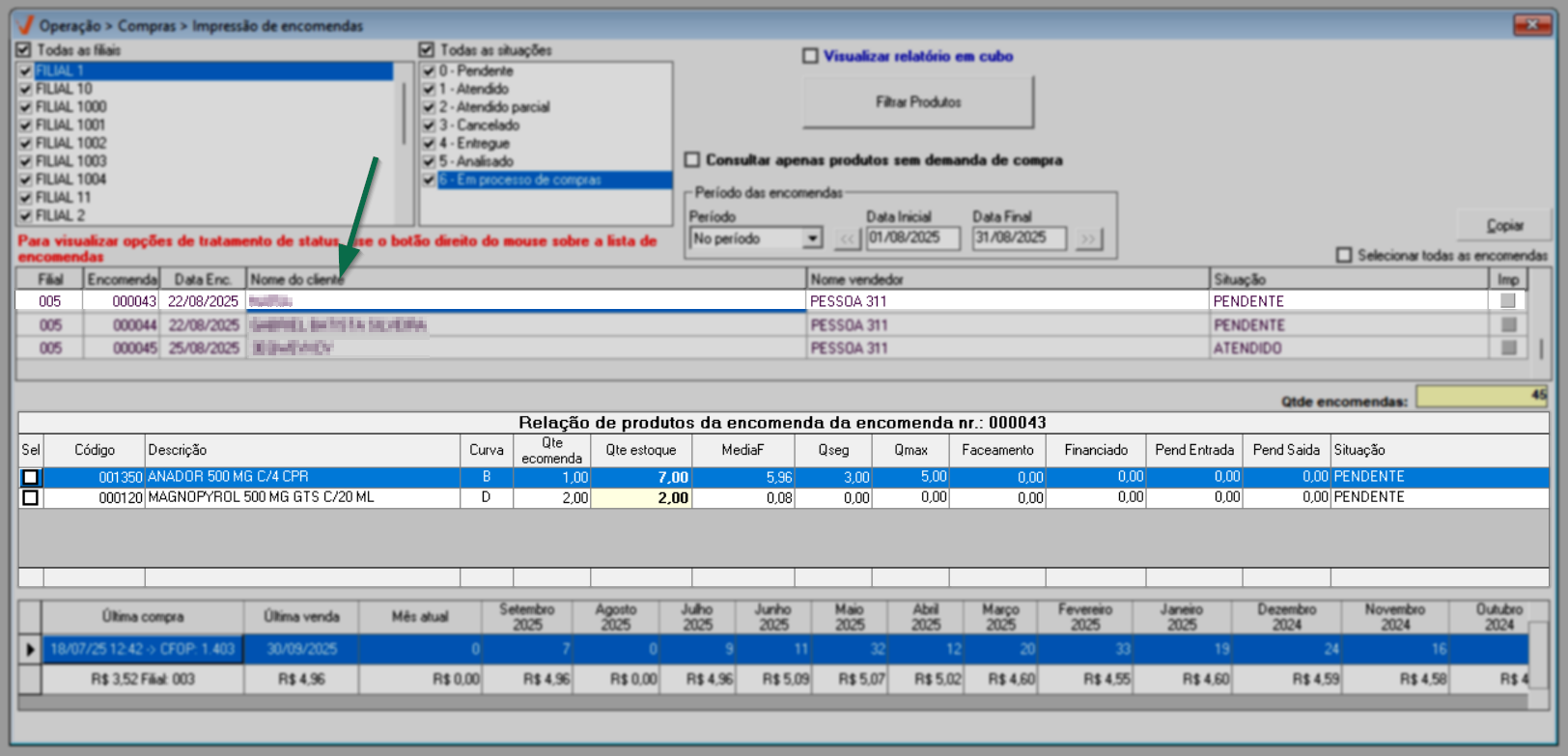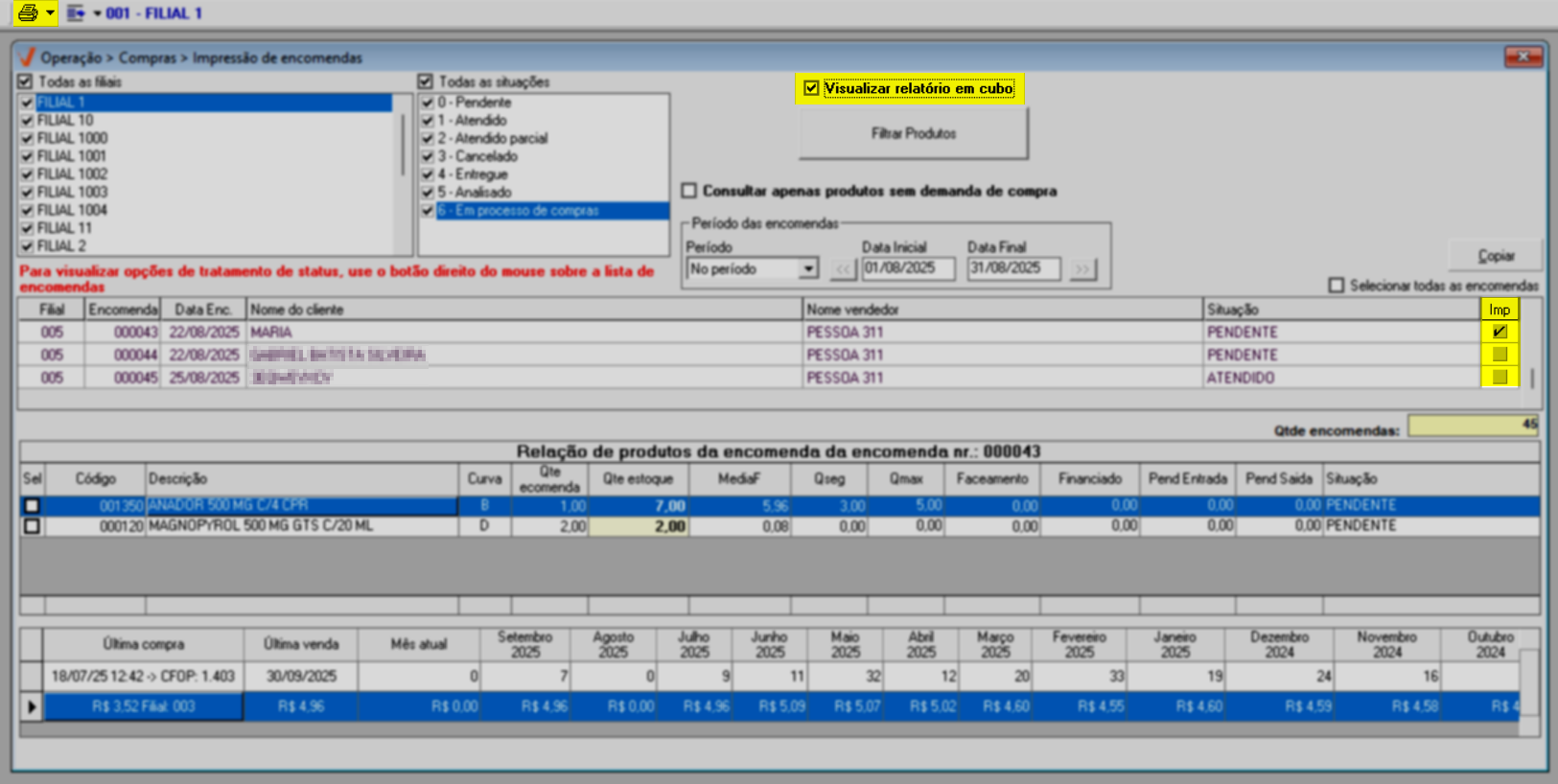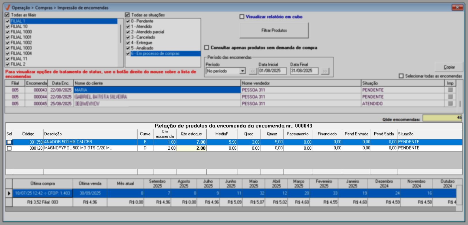 Uma encomenda é gerada quando o cliente solicita a compra de um produto que não está disponível em estoque na loja. Nesses casos, o vendedor registra um pedido de encomenda para informar ao comprador sobre a necessidade de compra. Depois, o comprador deve indicar se a compra do item foi de fato atendida ou não, permitindo que o vendedor informe ao cliente e finalize a venda, se necessário. Para facilitar a gestão dessas encomendas, cadastradas no módulo Orçamento, a aplicação Vetor Farma disponibiliza a tela "Impressão de Encomendas", que além de imprimir, permite consultar, excluir, gerar relatórios e marcar o status das encomendas como analisadas, atendidas e/ou canceladas. Leia o documento a seguir e aprenda a utilizar esta tela.