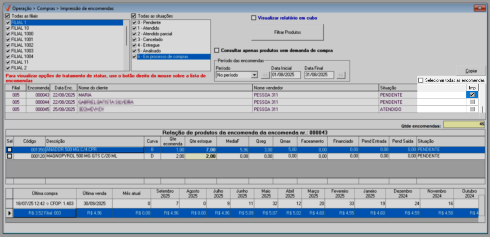 - Acesse o menu: Operação >> Compras >> Impressão de encomendas.