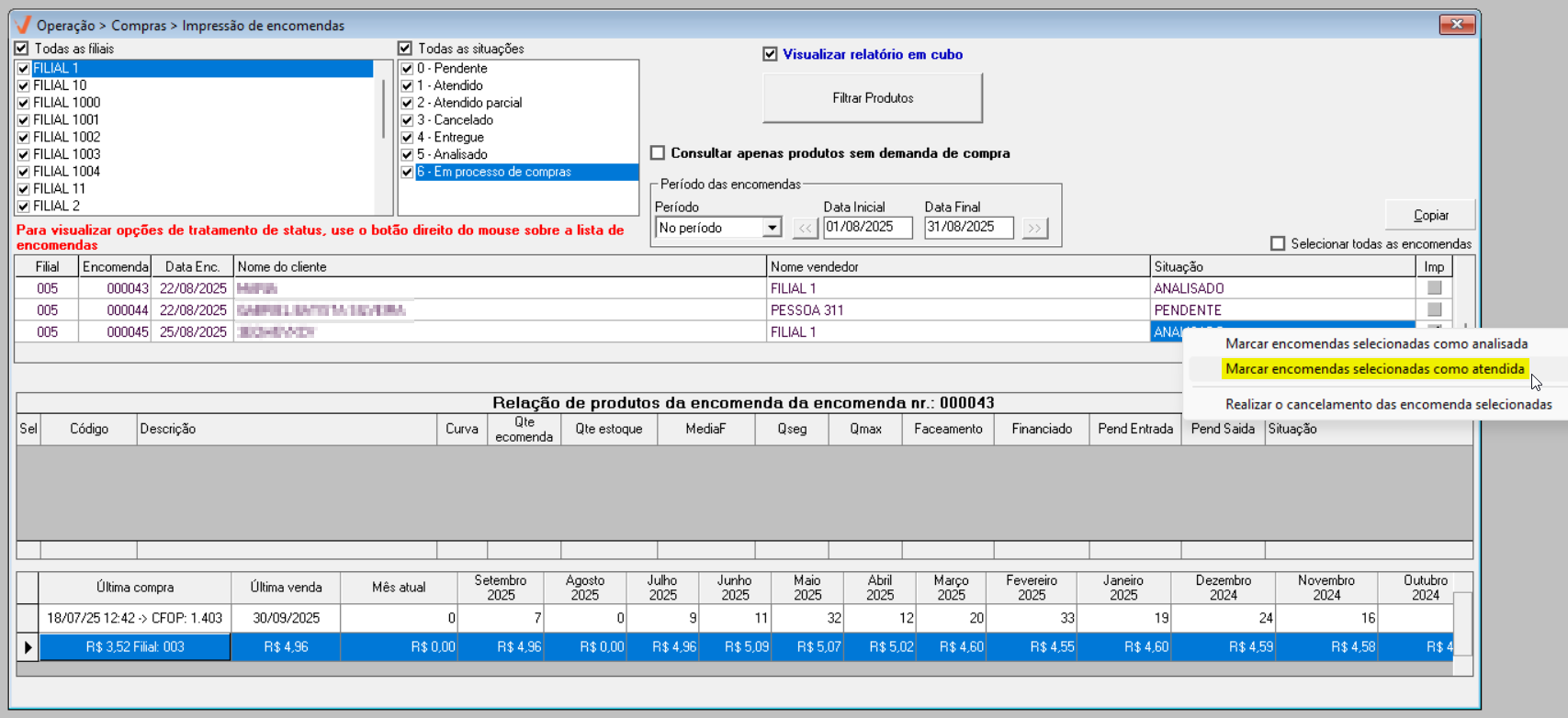 Durante o processo de gestão de encomendas, pode ser necessário atualizar o status de determinados produtos ou da encomenda como um todo, seja para indicar que foram analisados, que já foram atendidos ou que foram cancelados. Essas ações ajudam a manter o controle do fluxo de atendimento e facilitam o acompanhamento por outros setores envolvidos. Veja a seguir, como realizar cada uma dessas alterações.