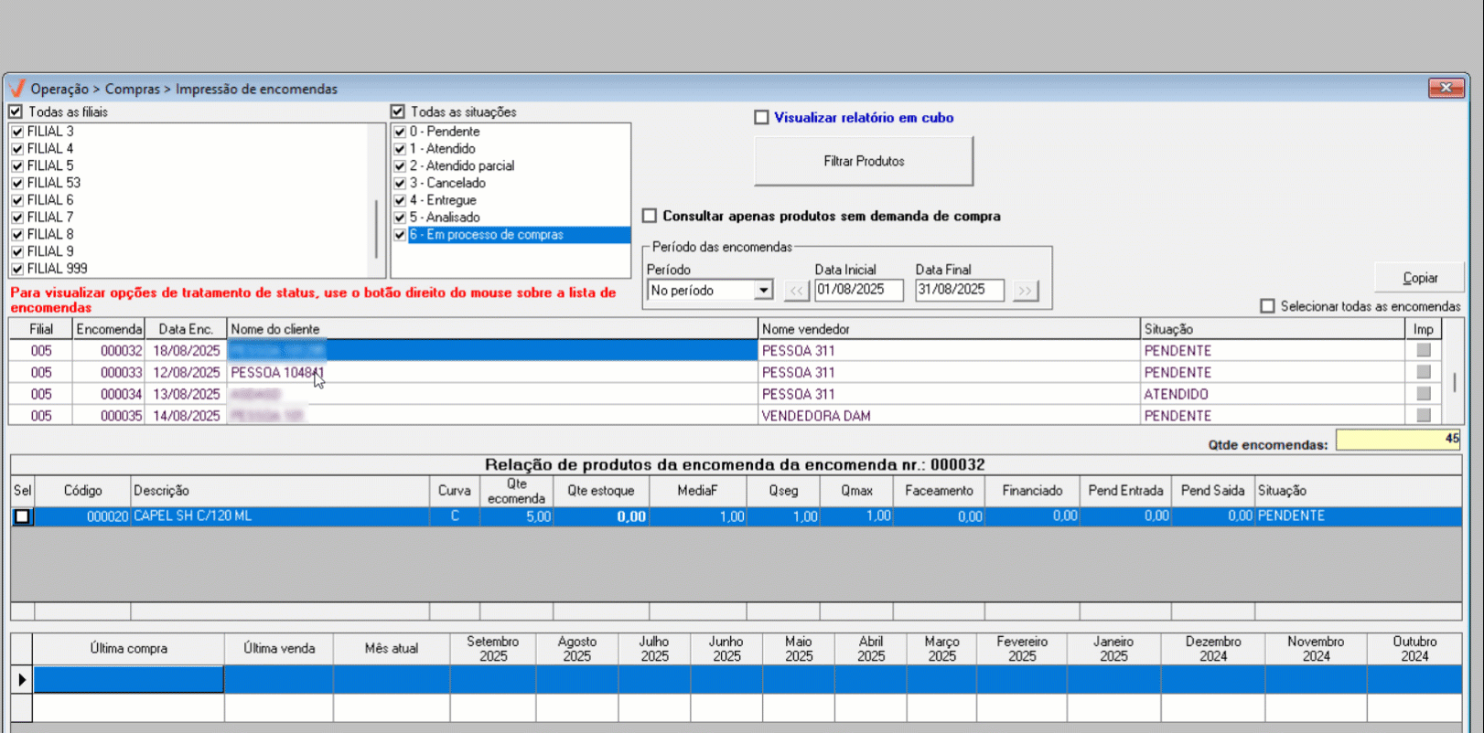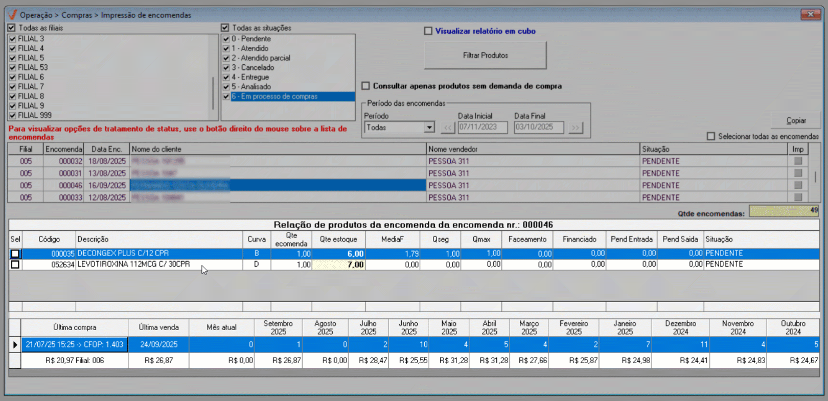 Ao clicar em cada produto da encomenda selecionada, será possível visualizar, na área inferior da tela, informações como: última compra, última venda, vendas do mês atual e o histórico de vendas dos últimos 12 meses. Essa análise é gerada de forma individual, ou seja, é atualizada conforme o usuário navega entre os produtos listados na encomenda.