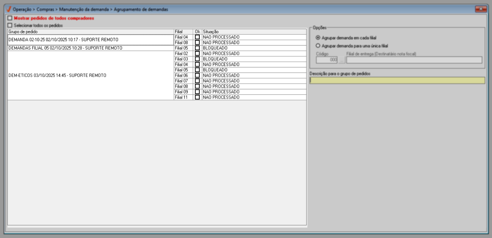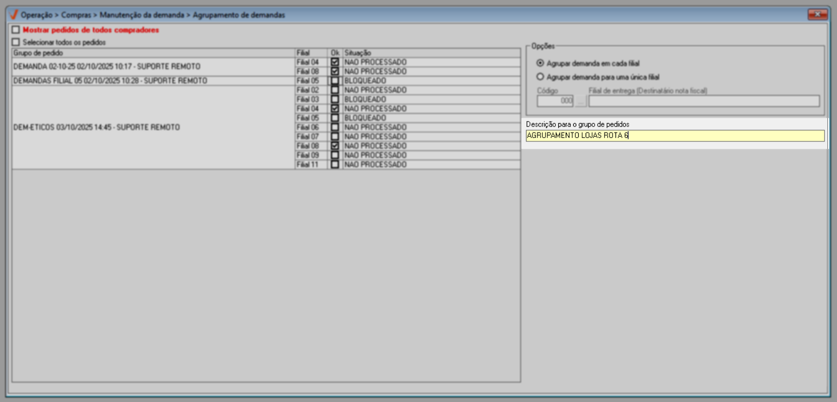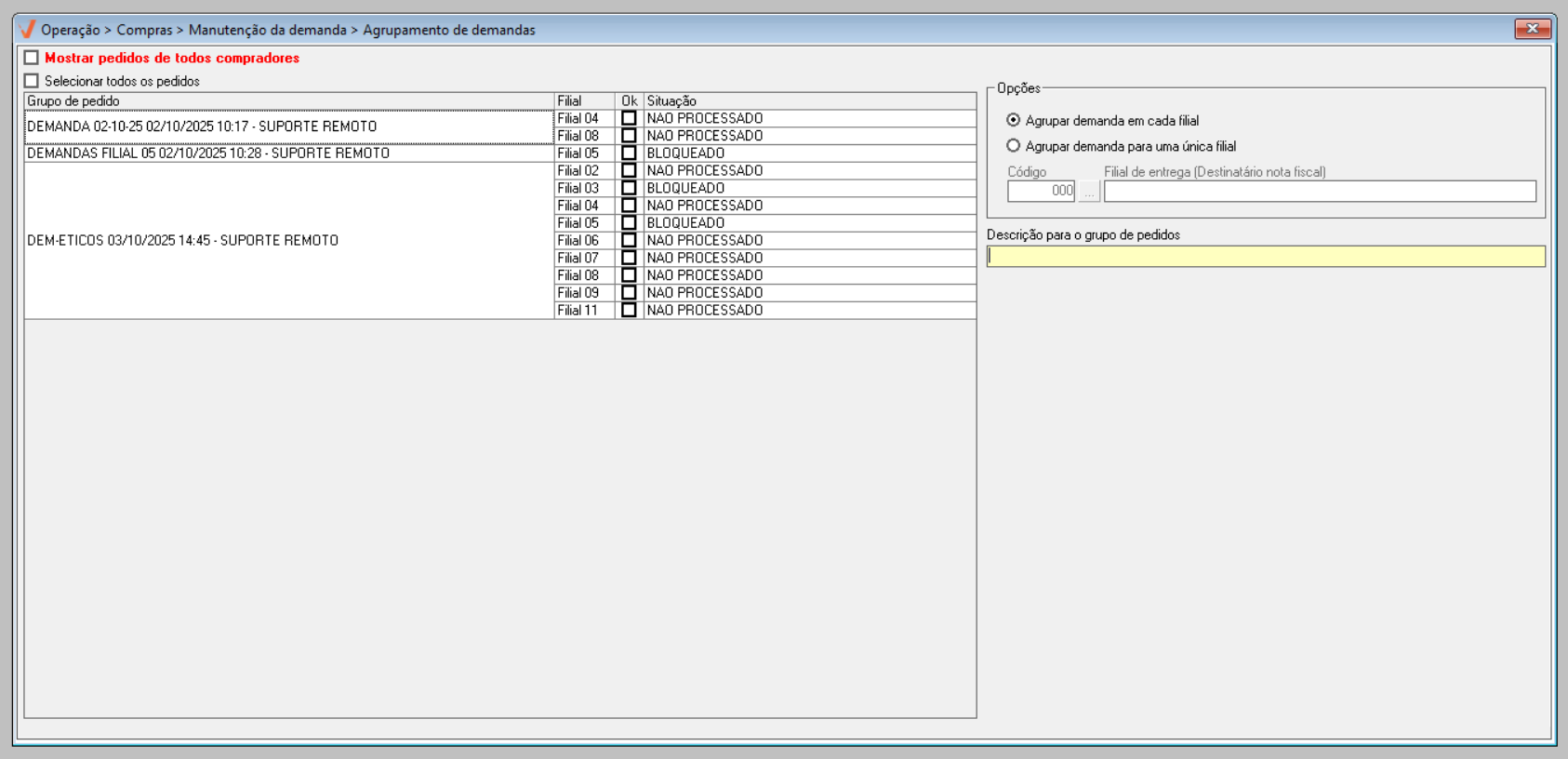 - Poderão ser agrupadas somente as demandas salvas, cujas filiais não tenham o parâmetro de bloqueio do fluxo de compras (GERAR_DEMANDA_COMPRAS_BLOQUEADA) ativado.