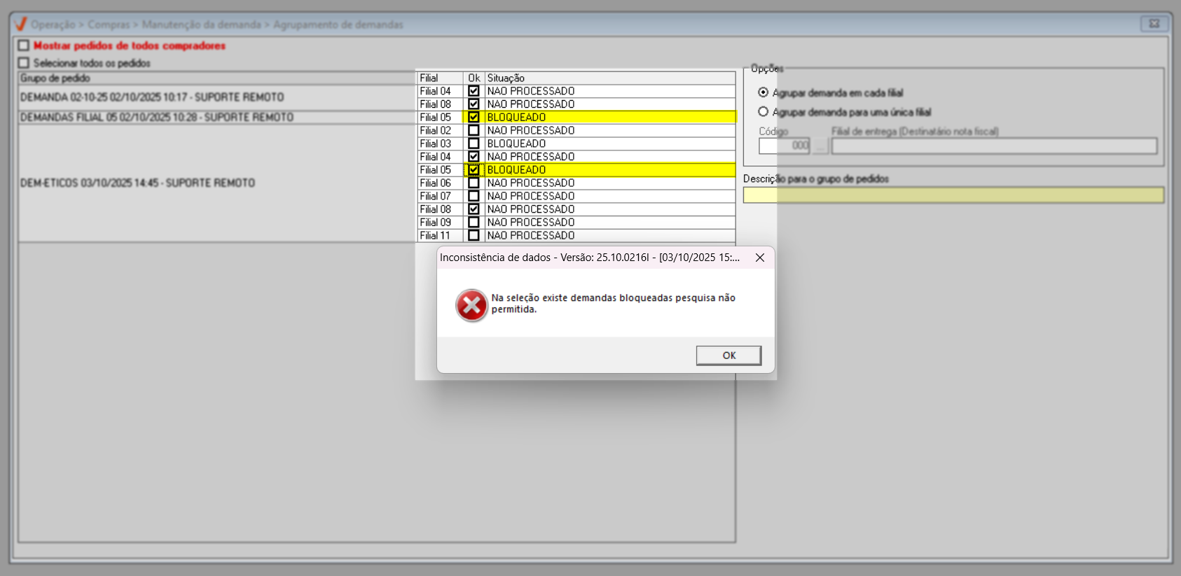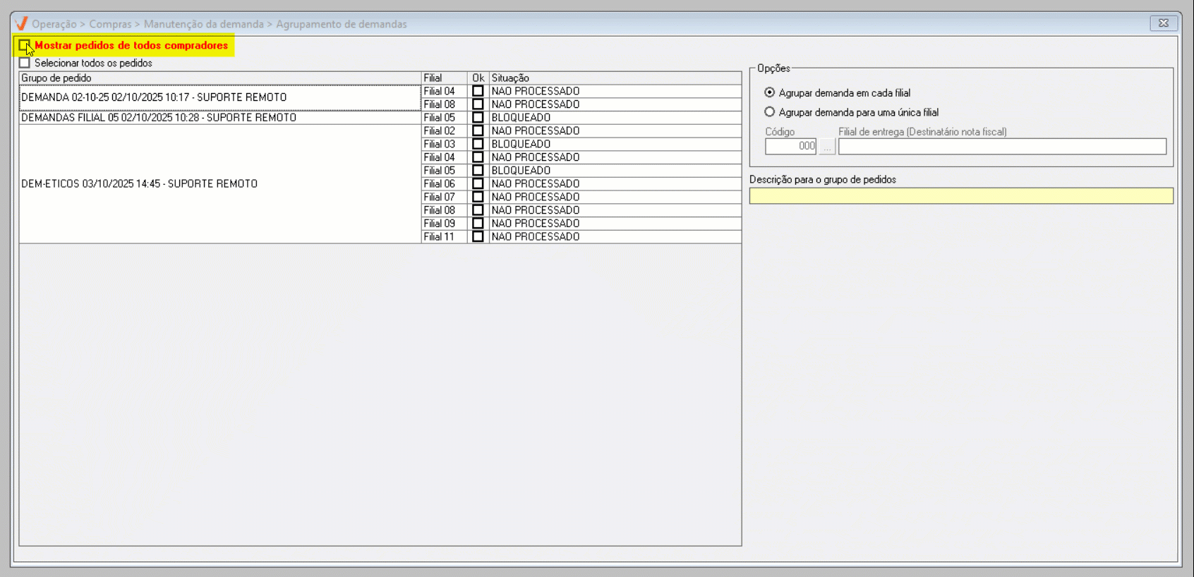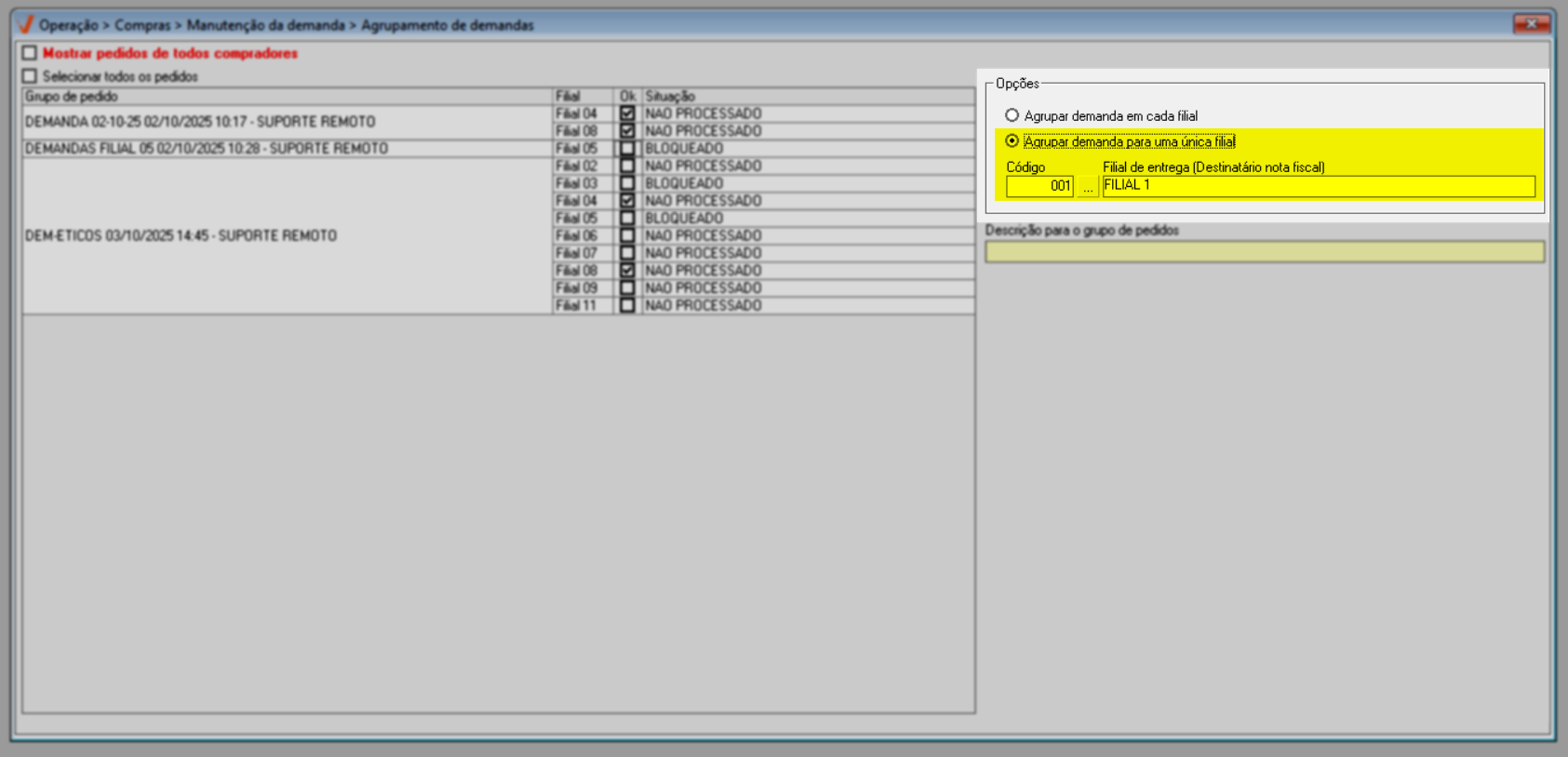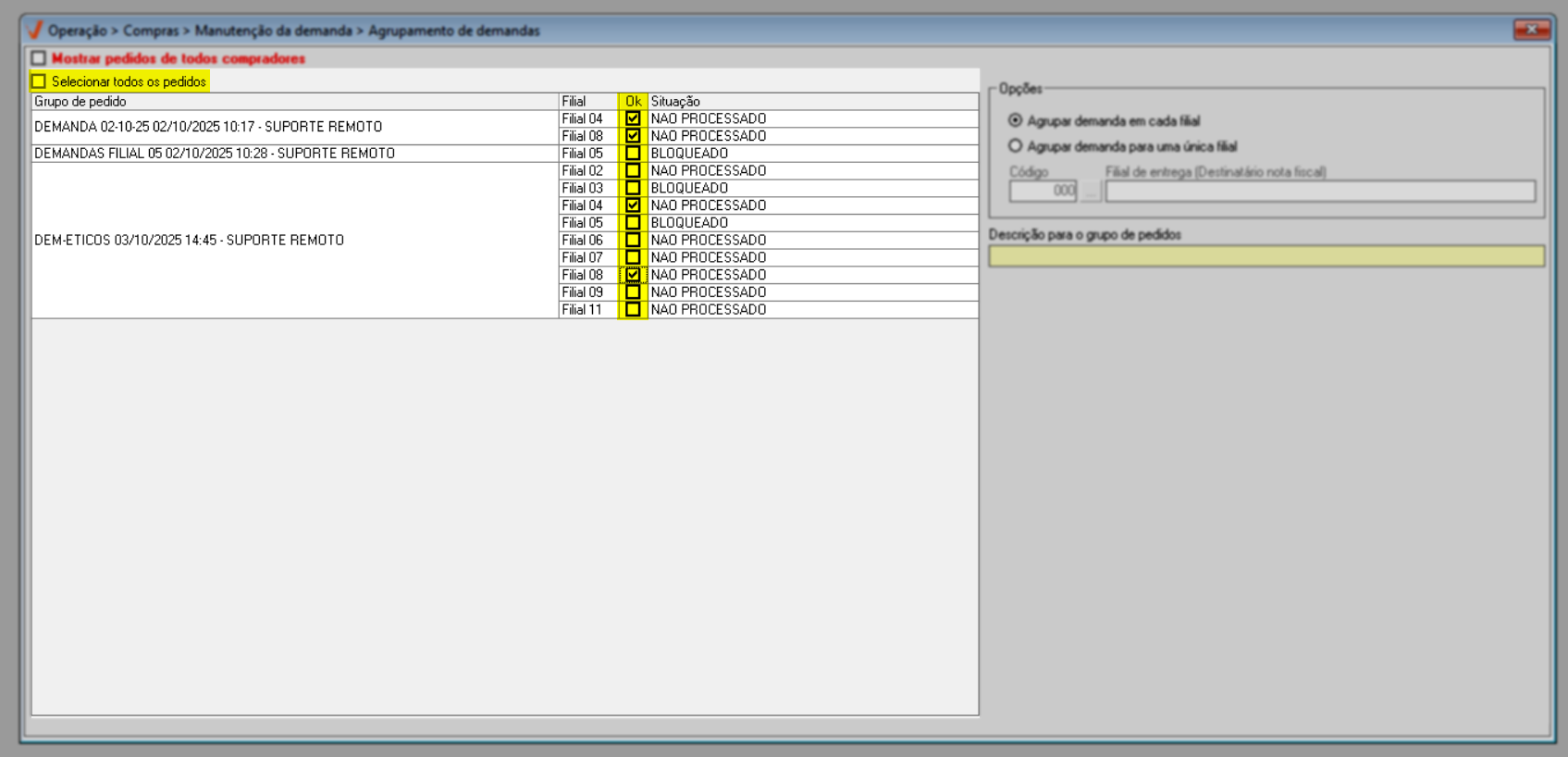 - Poderão ser agrupadas somente as demandas salvas, cujas filiais não tenham o parâmetro de bloqueio do fluxo de compras (GERAR_DEMANDA_COMPRAS_BLOQUEADA) ativado.