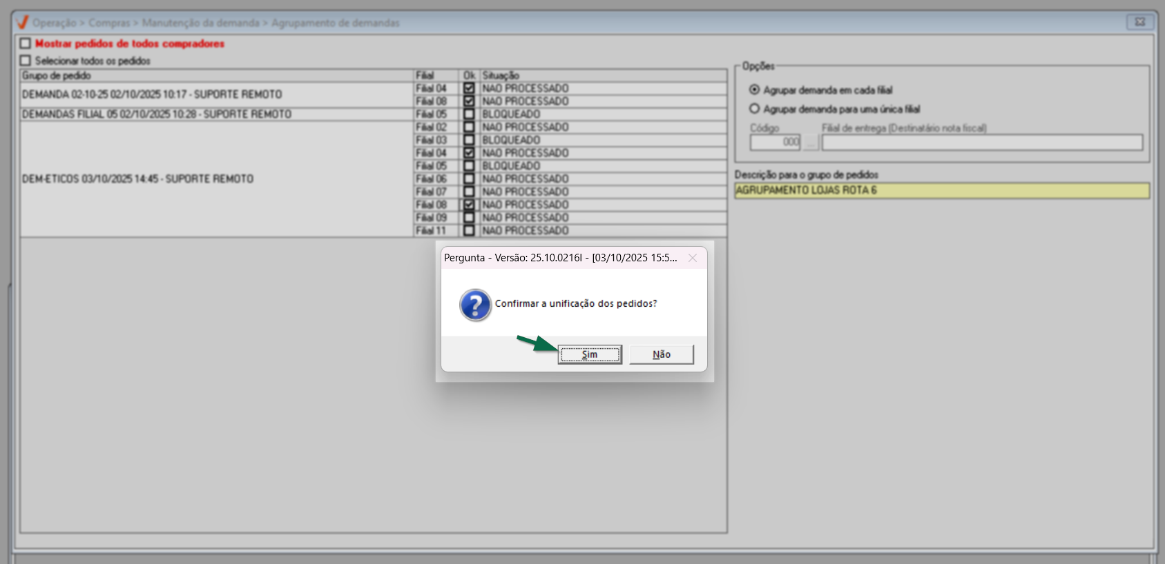 Por fim, para gravar o agrupamento, utilize o atalho F2. Se todas as demandas selecionadas estiverem com situação diferente de "Bloqueado", o sistema exibirá uma mensagem de confirmação. Basta confirmá-la para concluir o agrupamento com sucesso.