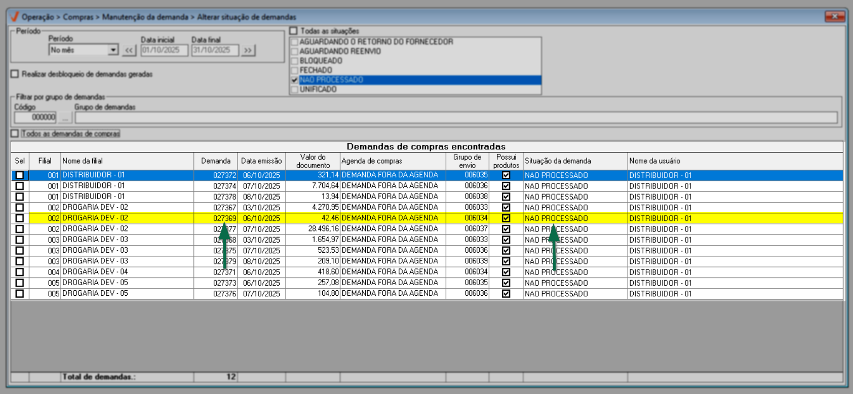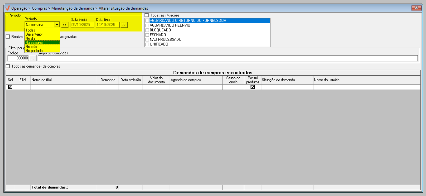 - Acesse o menu: Operação >> Compras >> Manutenção de demanda >> Alterar situação de demandas.