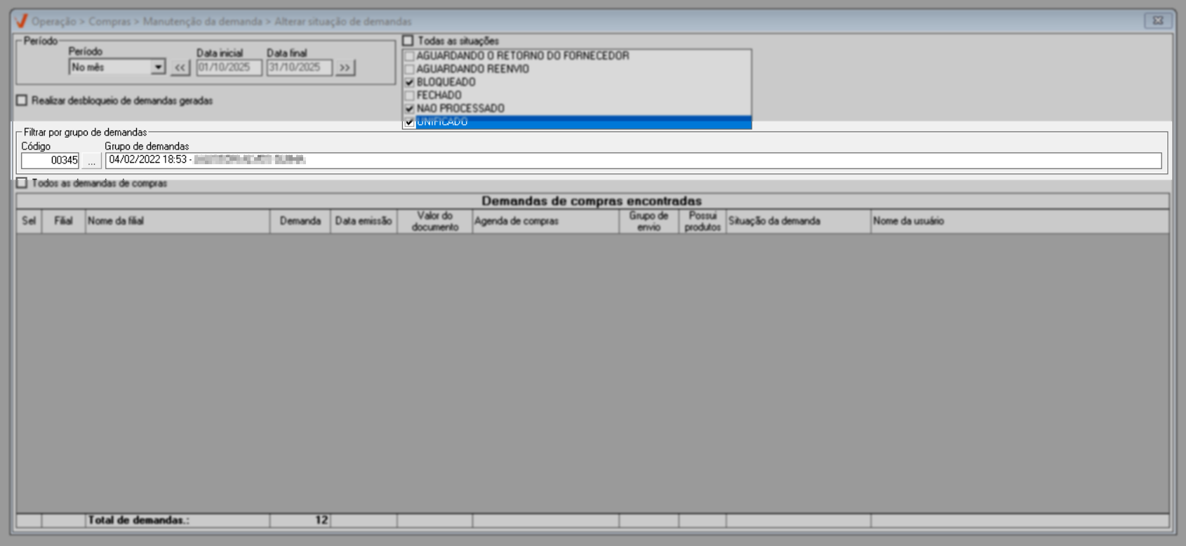 A tela “Alterar Situação de Demandas” permite ao usuário consultar demandas salvas conforme um período específico, situação e grupo de demandas. Além disso, é por meio dessa tela que o usuário pode desbloquear uma demanda bloqueada, alterando sua situação para “Não processada” e possibilitando que ela retorne ao fluxo normal de compras.