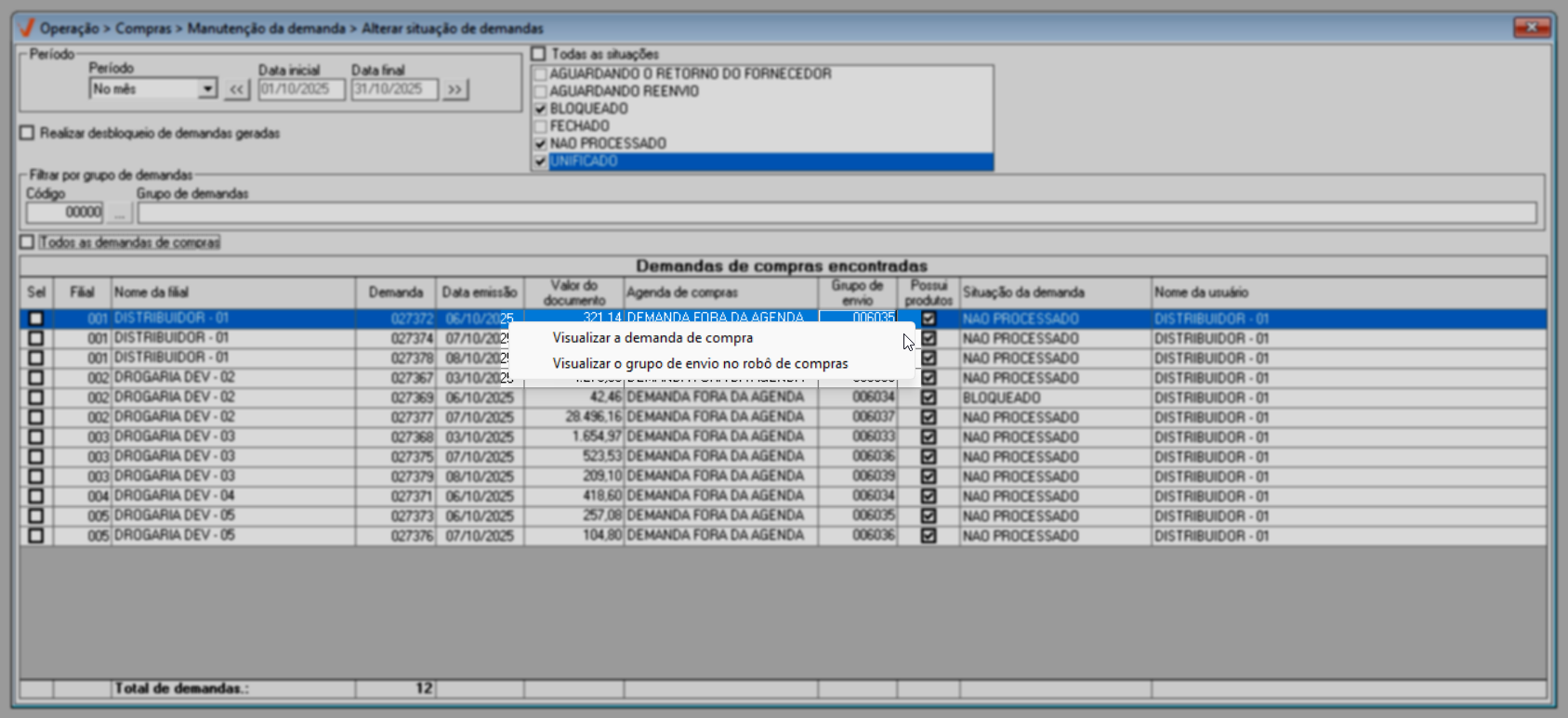 Para proporcionar uma análise mais detalhada, ao selecionar uma demanda e clicar com o botão direito do mouse, o sistema exibirá um menu de atalhos com duas opções que direcionam para outras telas relacionadas. A primeira opção, "Visualizar a demanda de compra", abre a tela "Alteração da Demanda", onde são apresentados todos os detalhes da solicitação, permitindo ao usuário realizar eventuais manutenções. Já a segunda opção, "Visualizar o grupo de envio no Robô de Compras", direciona para a tela "Ativação de Compra Automática (Robô)", possibilitando a consulta do grupo de envio vinculado à demanda.