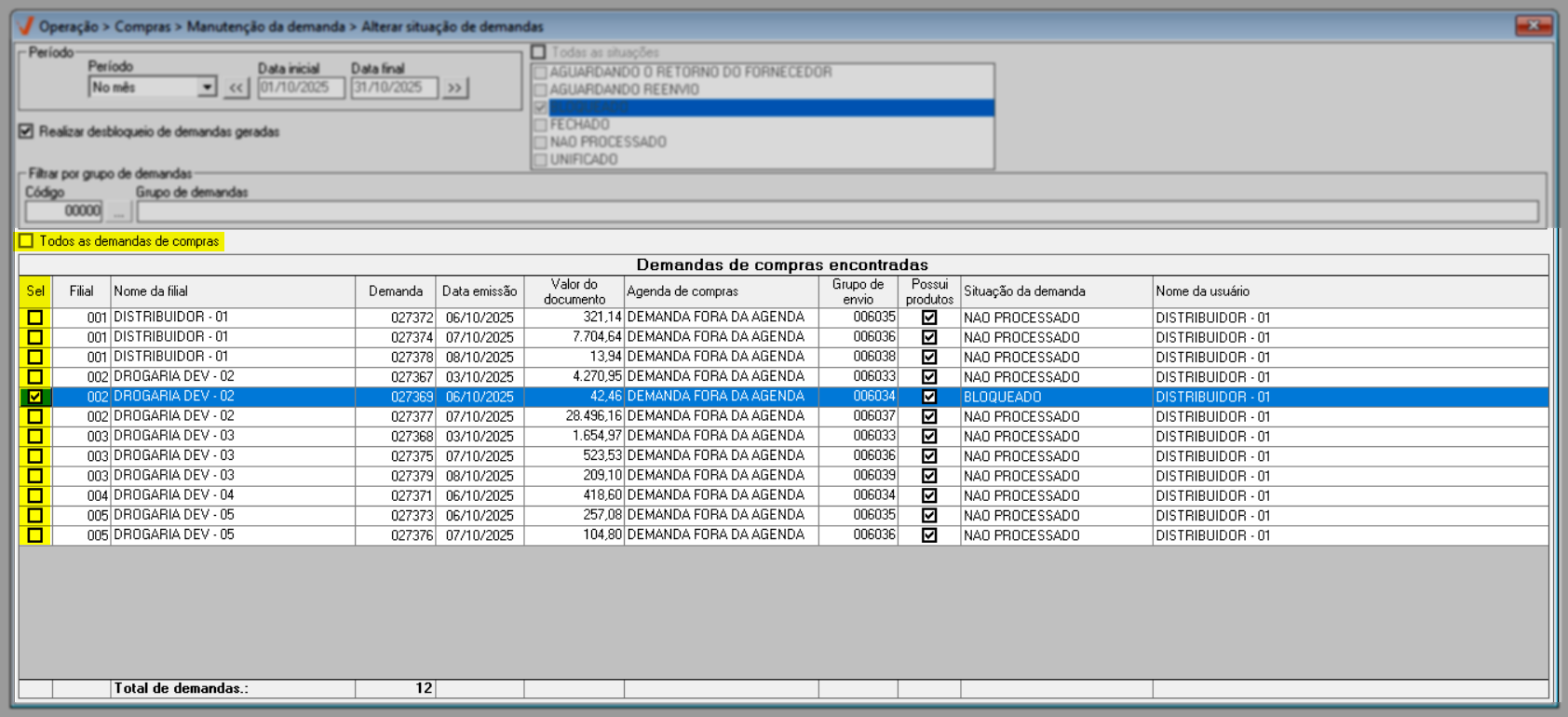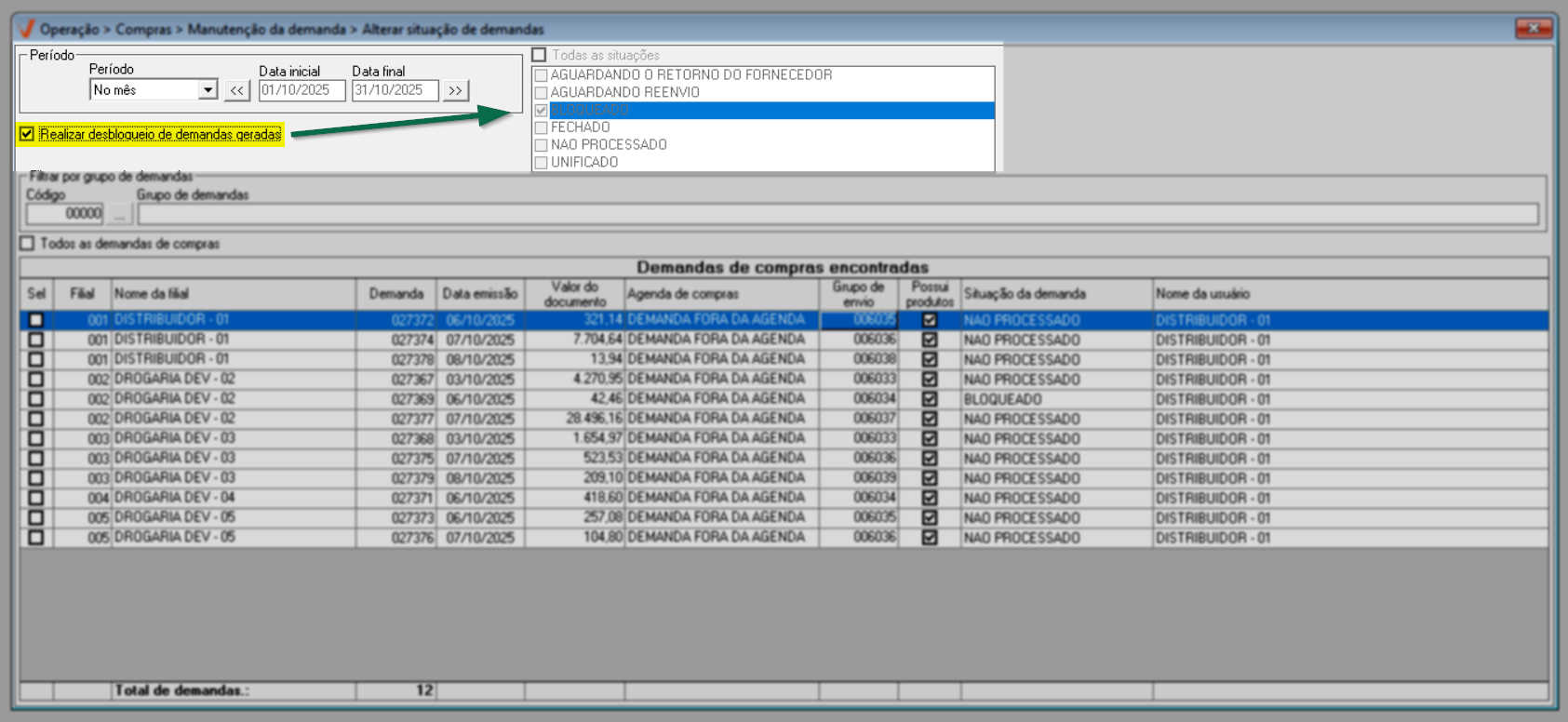 Apenas as demandas com situação “Bloqueado” podem ter sua situação alterada nessa tela. Clique aqui para acessar o documento "Geração de demanda para compra" e entender melhor como funciona a configuração do bloqueio e como gerar uma demanda de compra. O bloqueio das demandas ocorre de acordo com a configuração do parâmetro por filial denominado “GERAR_DEMANDA_COMPRAS_BLOQUEADA”, que tem como finalidade restringir temporariamente o início do processo de compras em determinadas filiais. Quando esse parâmetro está ativo, a demanda criada permanece bloqueada, impedindo o avanço do fluxo de compras apenas nas lojas configuradas. Dessa forma, é necessário que um usuário autorizado realize a análise e o desbloqueio da demanda, garantindo que o processo de compras possa prosseguir normalmente nas etapas seguintes.