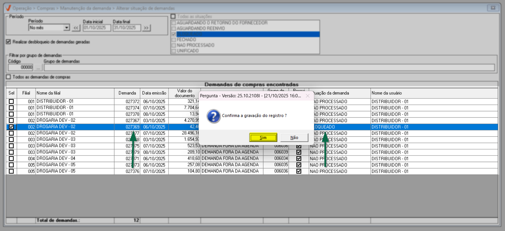 Após selecionar as demandas bloqueadas, pressione o atalho >>F2 para concluir o processo de alteração da situação. Em seguida, o sistema exibirá uma mensagem de confirmação solicitando que o usuário valide a operação. Basta confirmar para que as demandas selecionadas sejam atualizadas e passem a ter a situação “Não processada”, permitindo que retornem ao fluxo normal de compras. Perceba no exemplo abaixo que a demanda de número 27369 está com status bloqueado antes da confirmação do desbloqueio: