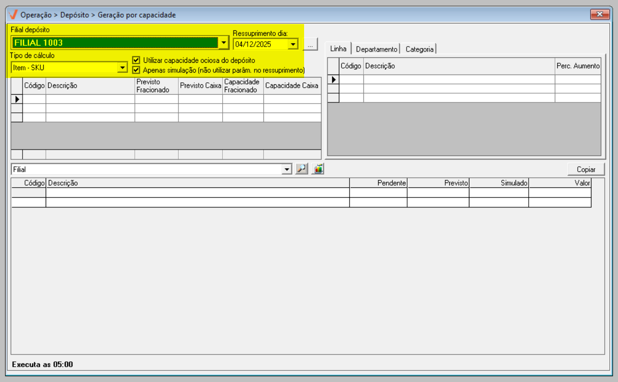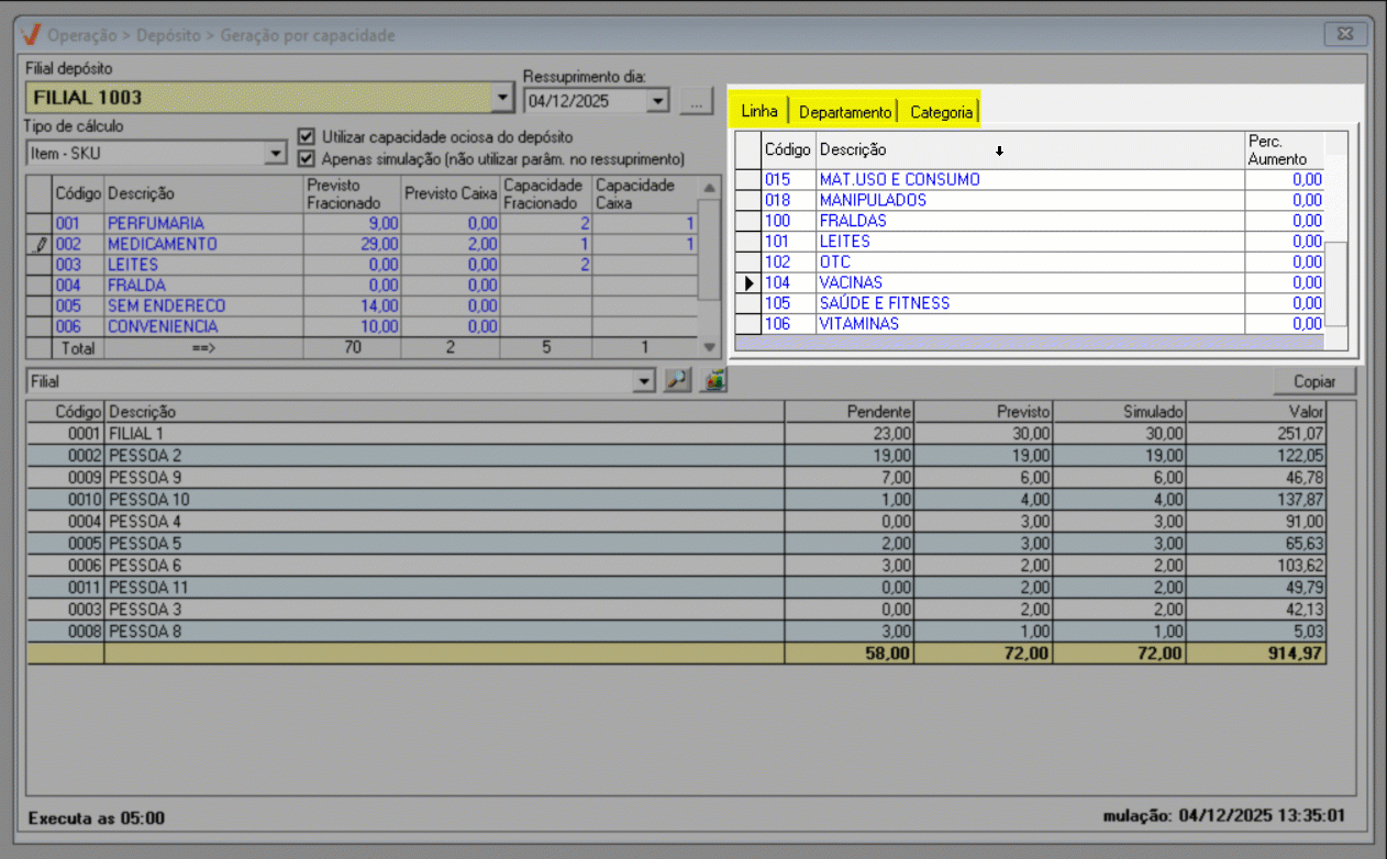 Na seção inferior da tela, o sistema apresenta os detalhes da simulação, por filial, conforme a aba selecionada (linha, departamento ou categoria) .
