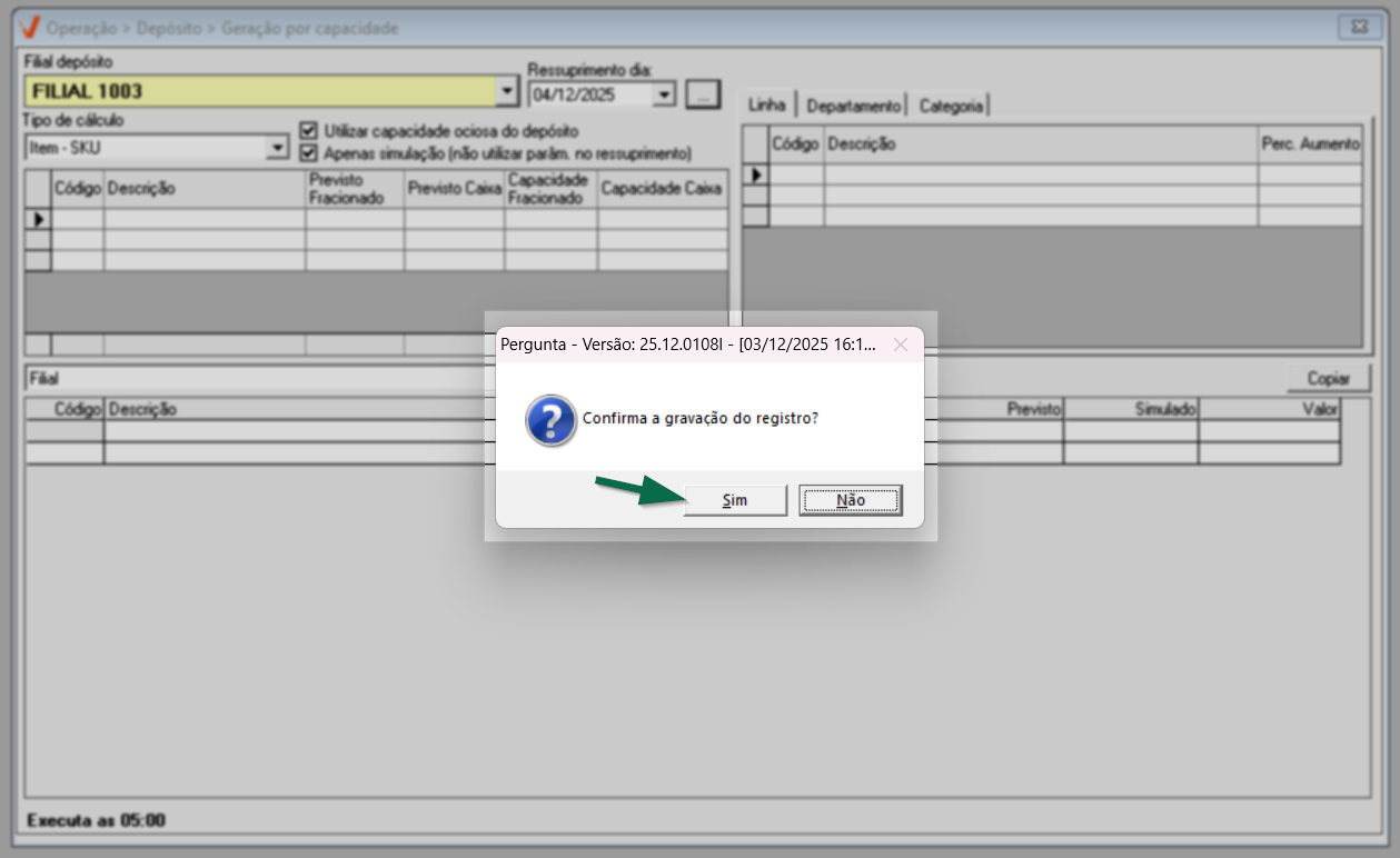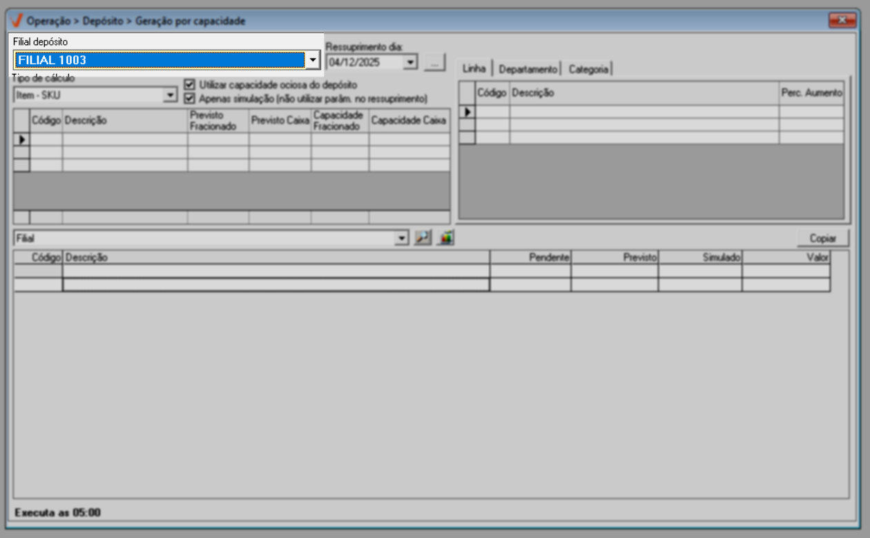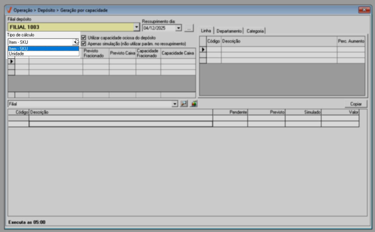 - Acesse o menu: Operação >> Depósito >> Geração por capacidade.