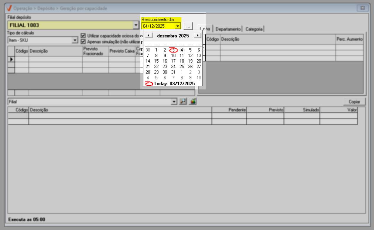 Na sequência, o campo "Ressuprimento dia" determina a data-base utilizada para calcular ou simular a necessidade de reposição. Por padrão, o sistema sugere o dia seguinte ao atual, porém, o usuário pode informar outra data válida desde que não seja anterior ao dia atual, o sistema não permite simulações retroativas.