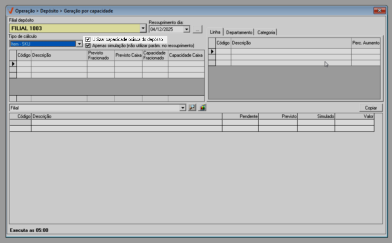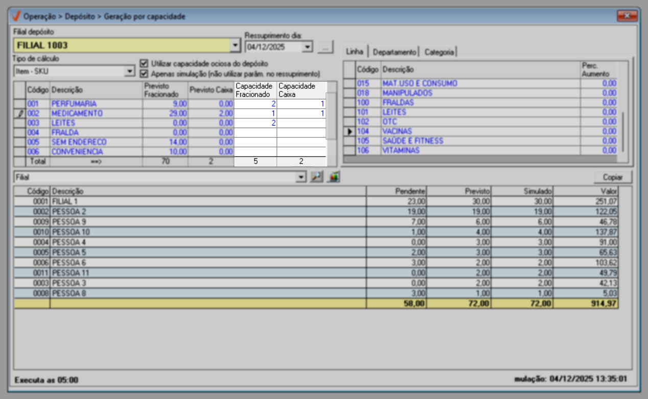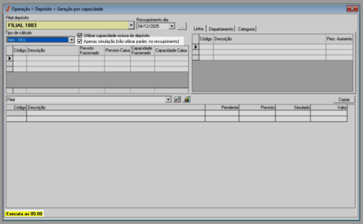A análise considera a capacidade física de separação do depósito. Por exemplo: se o depósito consegue separar 1.000 unidades por dia, mas o ressuprimento previsto para determinado dia é de 2.000 unidades, então 1.000 unidades excederão a capacidade, já que o depósito não consegue processar todo esse volume. A geração por capacidade serve justamente para ajustar quanto será ressuprido no dia, respeitando o limite operacional definido para o depósito.