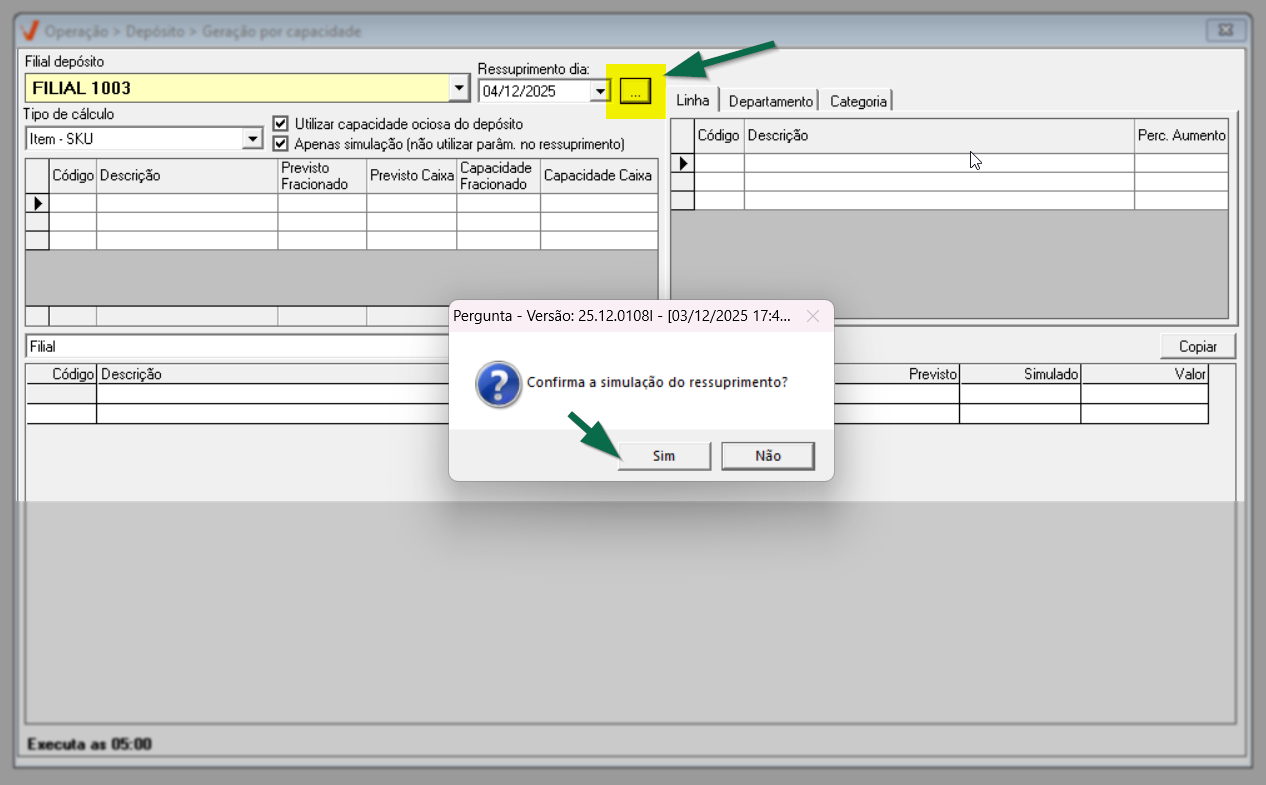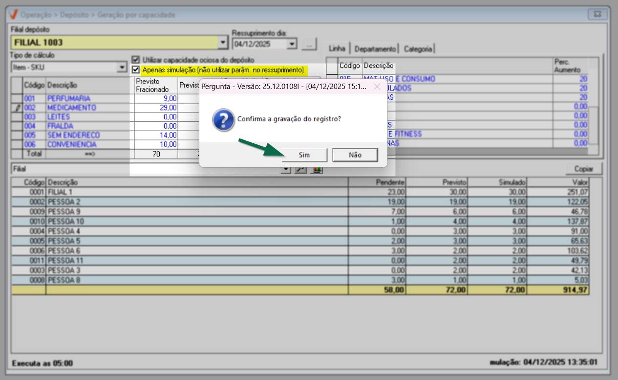 Caso já exista um ressuprimento registrado para a mesma data, o sistema exibirá uma mensagem informando o registro existente e perguntará se o usuário deseja continuar com a simulação. O usuário poderá então escolher “Sim” ou “Não”, conforme sua preferência.