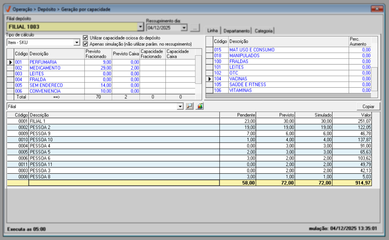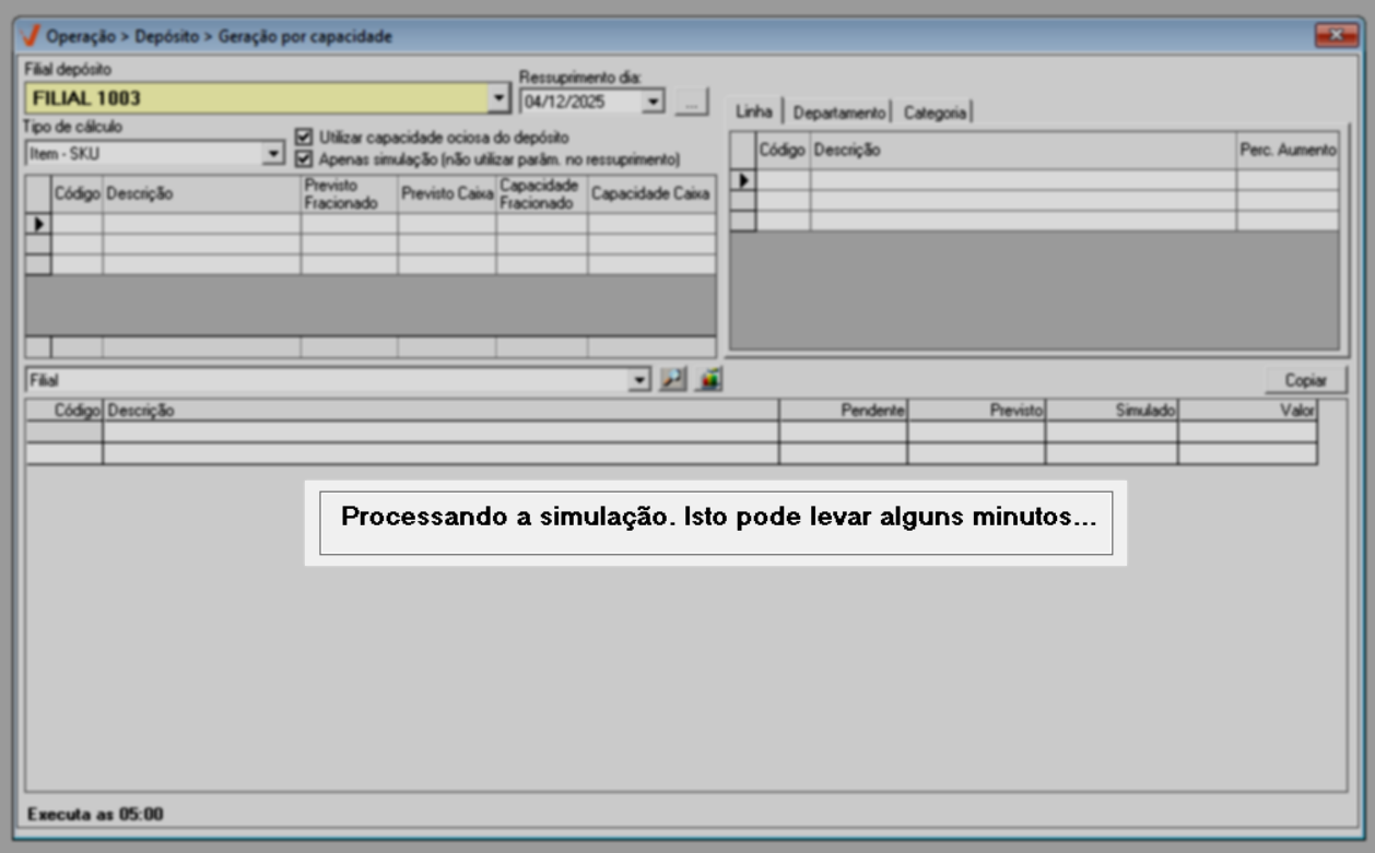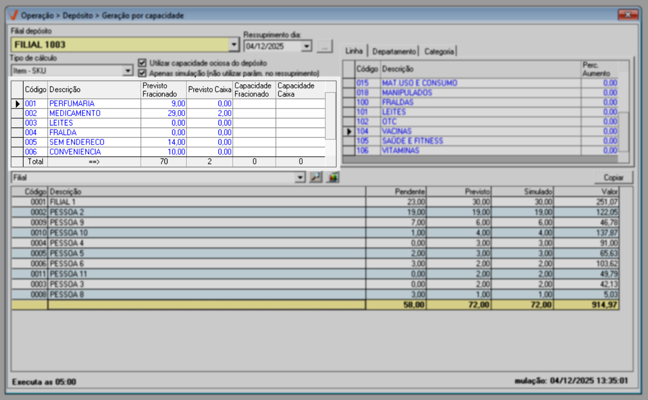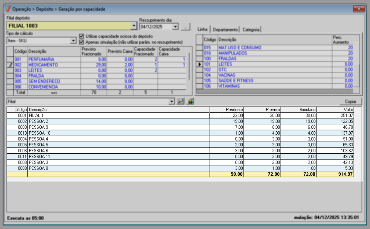 Essa abordagem é especialmente útil em períodos críticos como feriados, campanhas promocionais, ou virada de mês, por exemplo, quando o depósito costuma operar próximo ao limite. A simulação ajuda a prever o impacto da geração do ressuprimento antes de executá-lo oficialmente, garantindo que o planejamento ocorra dentro da capacidade real de trabalho e evitando sobrecargas ou falhas no atendimento.