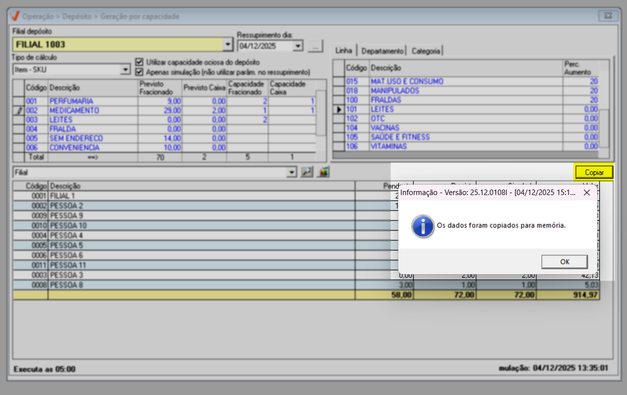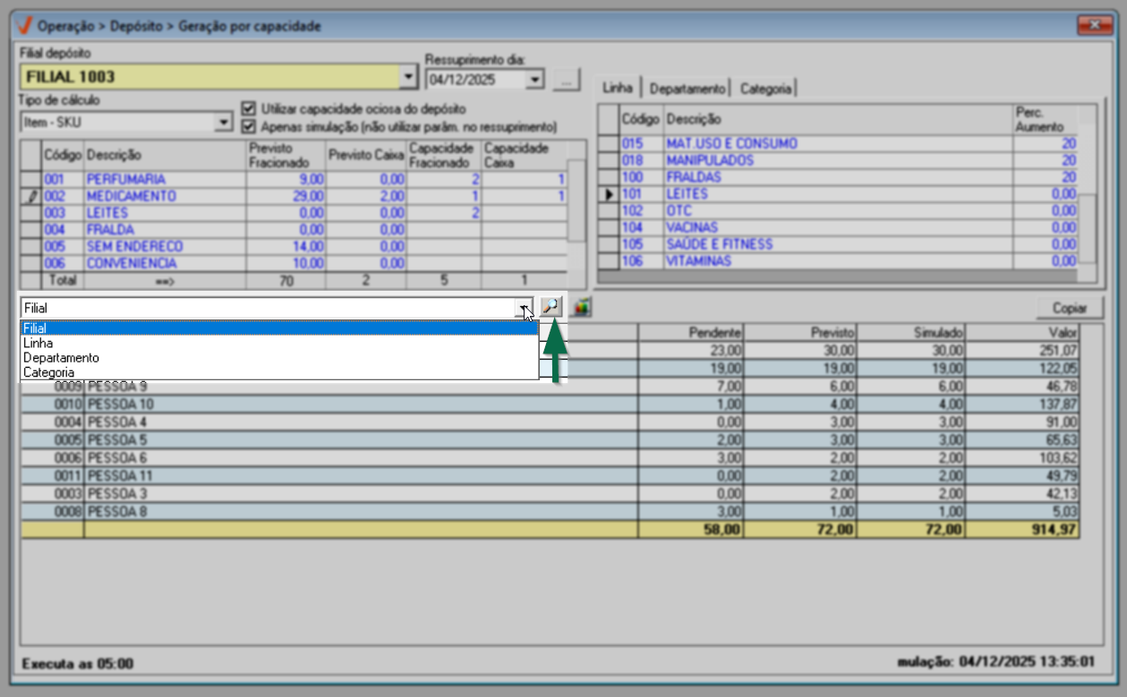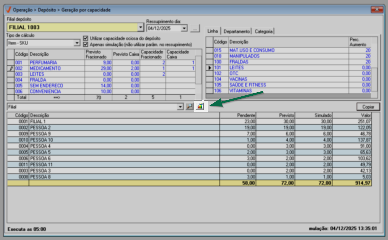 Essa abordagem é especialmente útil em períodos críticos como feriados, campanhas promocionais, ou virada de mês, por exemplo, quando o depósito costuma operar próximo ao limite. A simulação ajuda a prever o impacto da geração do ressuprimento antes de executá-lo oficialmente, garantindo que o planejamento ocorra dentro da capacidade real de trabalho e evitando sobrecargas ou falhas no atendimento.