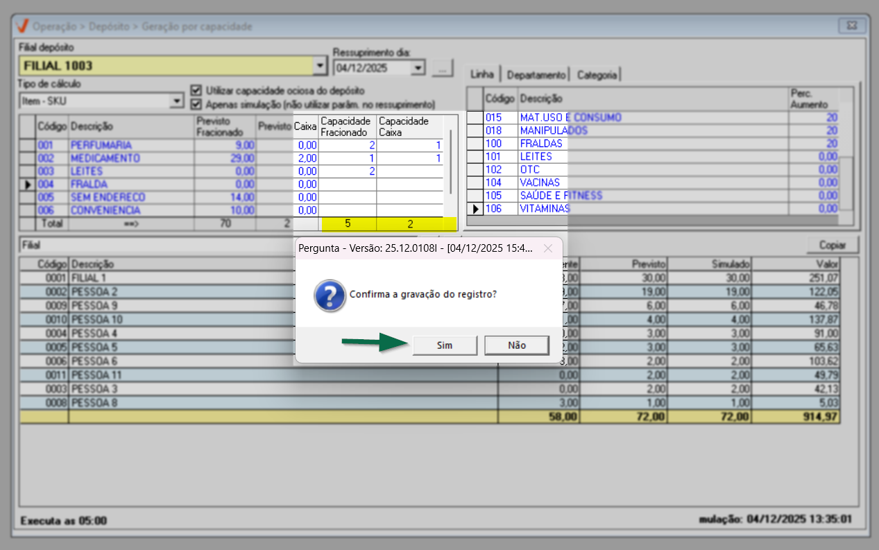 Logo na abertura da tela, é possível considerar a configuração padrão e pressionar o atalho >> F2, para gravar a simulação sem considerar parâmetros personalizados. Neste caso, se a soma da "Capacidade fracionada" for igual a zero, a simulação é imediatamente salva. Se a soma for maior que zero, o sistema exibirá uma mensagem solicitando confirmação do usuário antes de prosseguir. Em resumo, quando não há frações definidas, o sistema entende que não existem restrições ou percentuais aplicáveis e executa o processo com o comportamento padrão do ressuprimento.