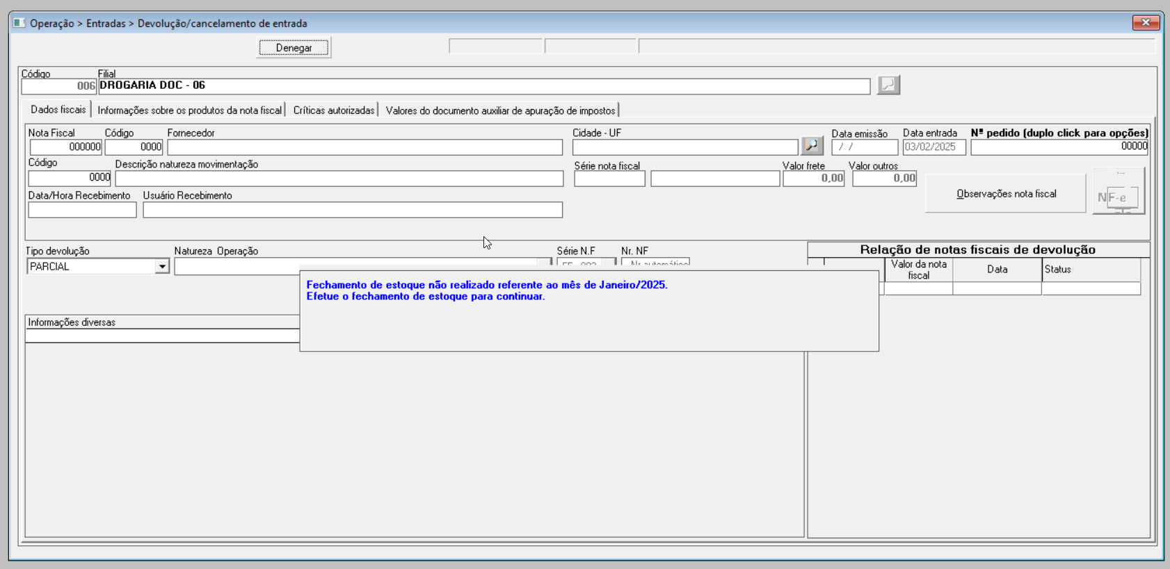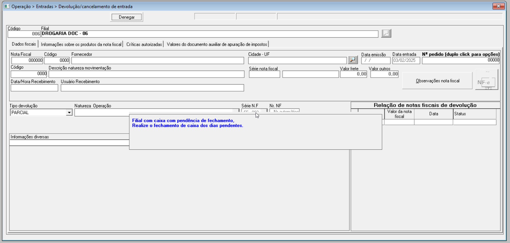 Se o parâmetro for configurado com o valor zero, o sistema não aplicará bloqueios, permitindo que as operações sigam sem restrições relacionadas ao fechamento do caixa. No entanto, caso o limite de dias seja atingido, o sistema bloqueará automaticamente determinadas movimentações, assegurando que o caixa seja fechado dentro do prazo estipulado. Quando esse bloqueio ocorrer, o sistema exibirá uma mensagem nas telas responsáveis pelas movimentações de estoque, informando o usuário sobre a restrição e fornecendo as orientações necessárias para a regularização. Veja o exemplo a seguir: