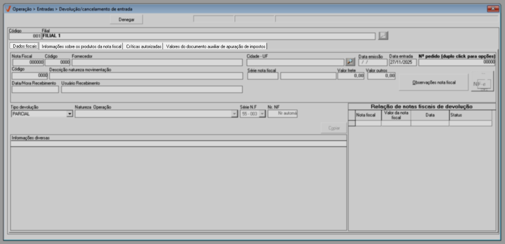 - Inicialmente, para manusear a tela, é necessário identificar o documento. Portanto, é indispensável que a nota fiscal esteja devidamente registrada no sistema.