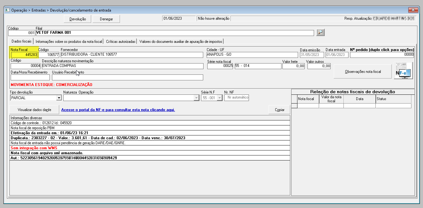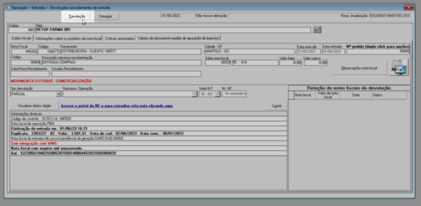 Quando houver produtos devolvidos para o documento selecionado, a seção "Relação de Produtos Devolvidos" exibirá esses produtos para fins de conferência.