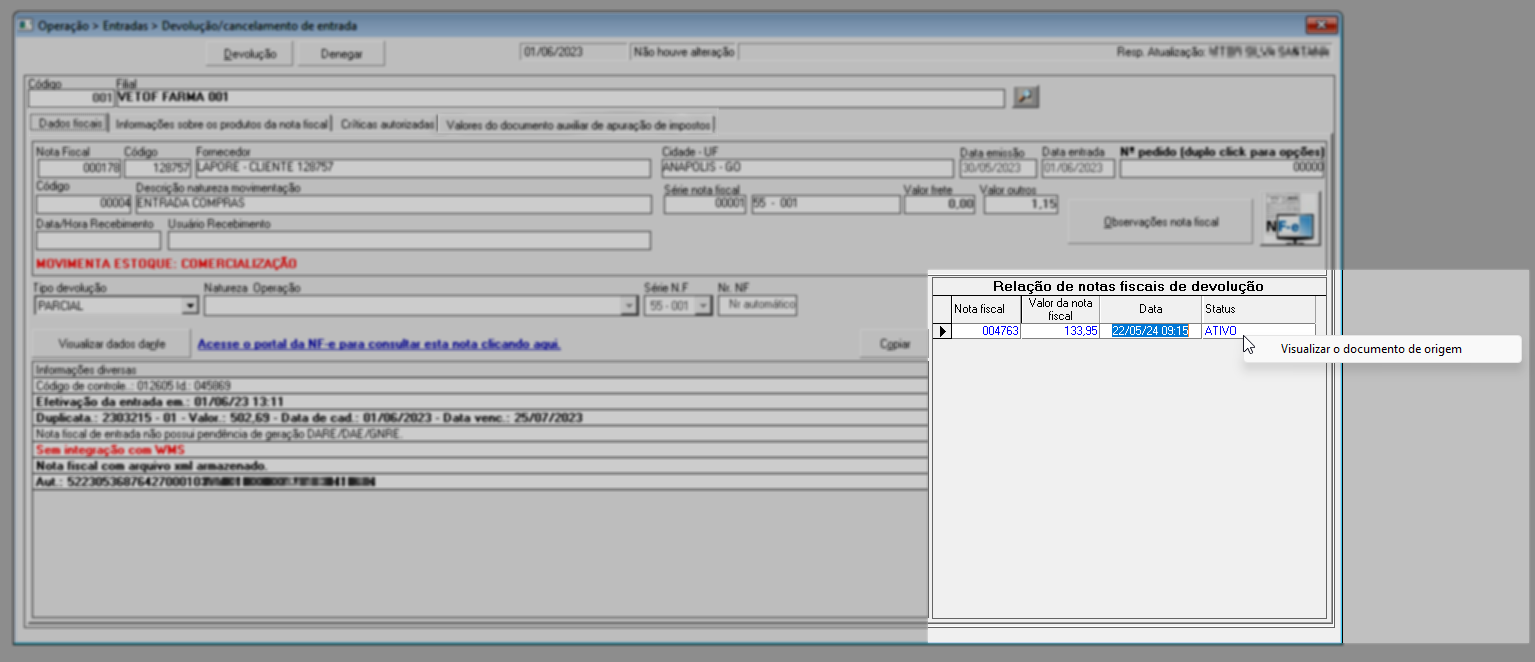 Uma seção que merece atenção especial é a "Relação de notas fiscais de devolução", localizada no lado direito da tela. Esta seção exibirá os documentos de devolução emitidos para o documento selecionado, caso existam. É importante verificar esta área para acompanhar o histórico de devoluções relacionadas ao documento atual. Além disso, ao acionar o botão direito do mouse, a opção "Visualizar documento de origem" permitirá acesso à tela de "Manutenção de notas fiscais", detalhando a devolução em questão. Portanto, acione-a se necessário.