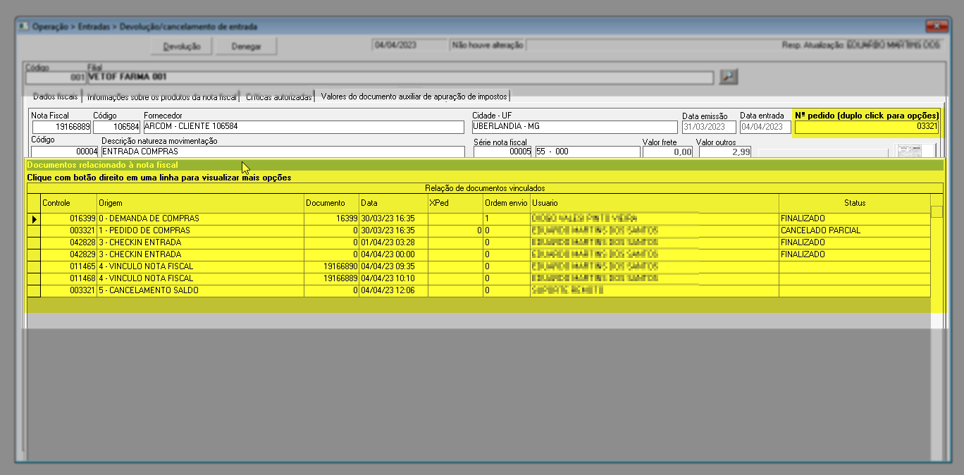 E caso o documento já possua um pedido de compra vinculado, ao efetuar um duplo clique sobre o campo mencionado, a tela retornará à relação dos documentos relacionados à nota fiscal, veja o exemplo a seguir: