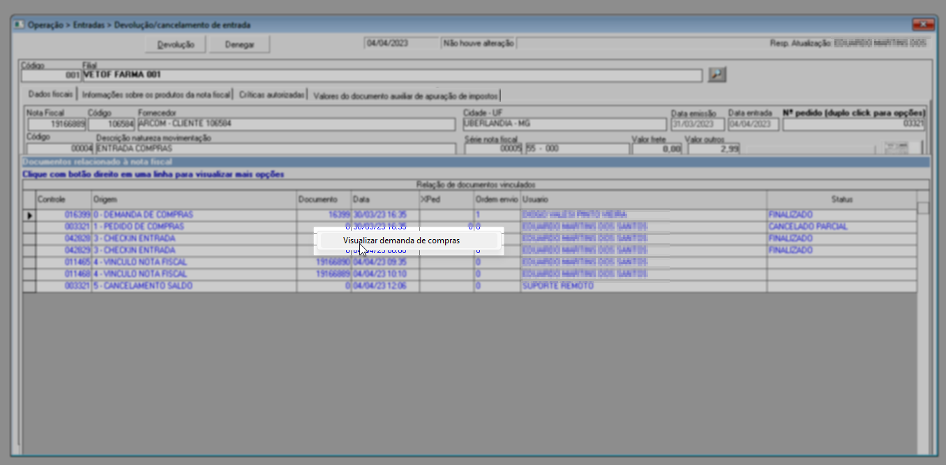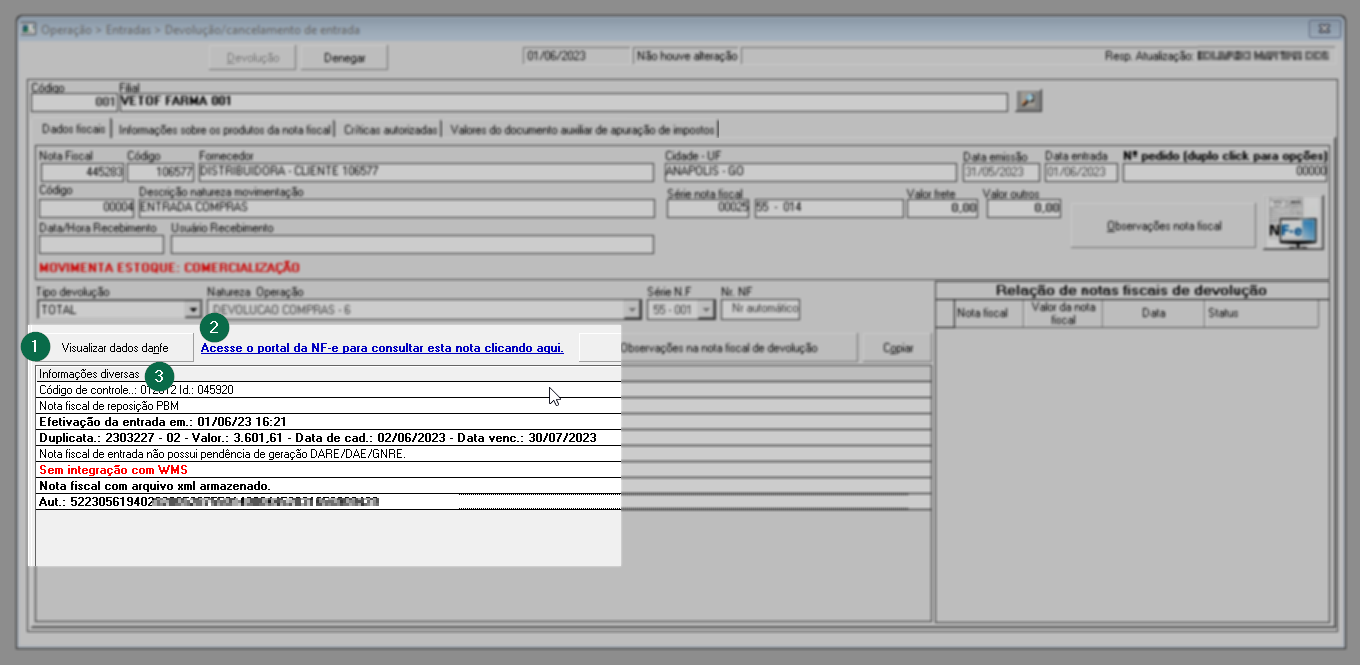 Informações diversas (3): Aqui, o usuário terá uma visão ampla das diversas ações aplicadas ao documento, bem como orientações sobre as operações registradas. Além disso, algumas dessas informações acompanham funcionalidades, como por exemplo: visualizar documentos de origem, reprocessar PBM, copiar registros, caso a empresa disponha dessa funcionalidade, enviar a nota fiscal para o WMS, entre outras conforme o tipo de informação apresentada. Para acioná-las e aplicá-las, clique sobre a linha da informação e use o botão direito do mouse para acessar as ações. Caso não apresente nenhuma, não existe ação para a linha selecionada.