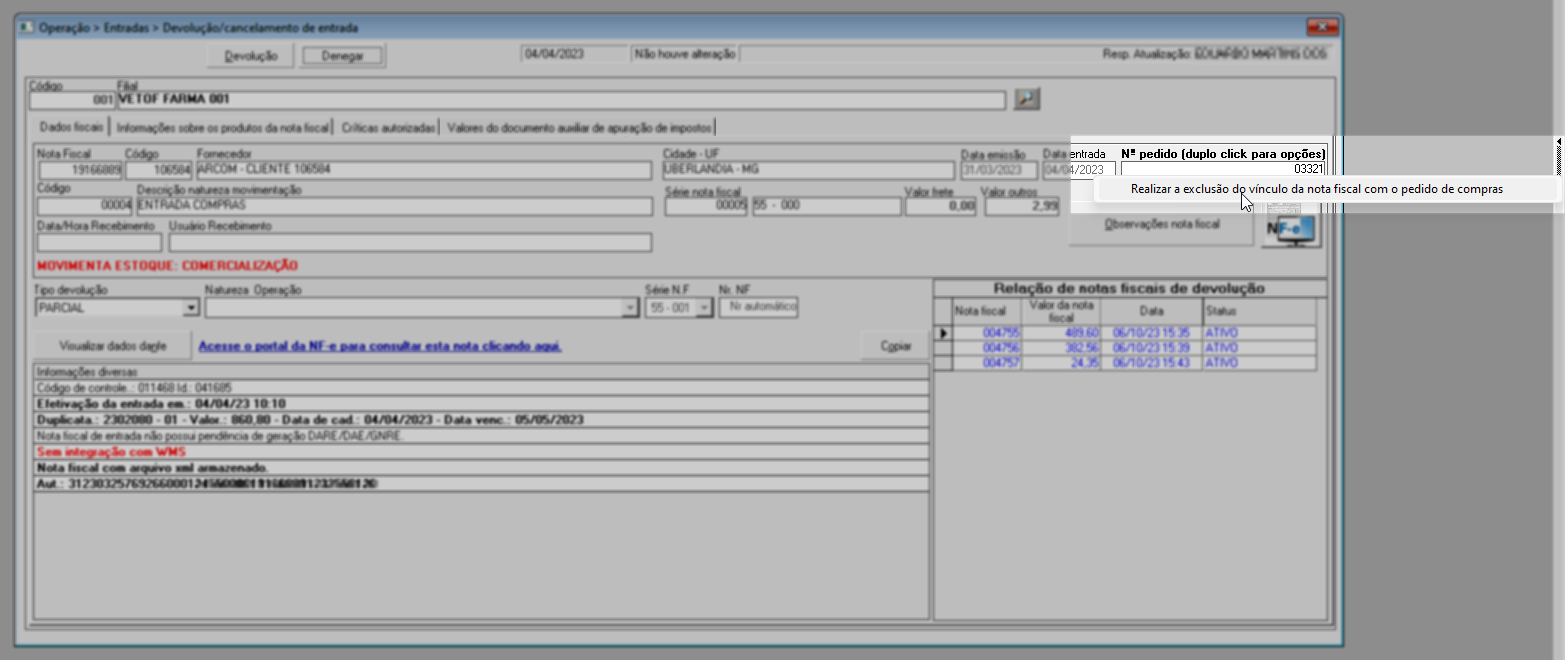 Ainda, se for necessário desvincular o pedido de compra associado a um documento. No campo "Nº pedido (duplo click para opções)", clique com o botão direito do mouse e escolha a opção >> Realizar a exclusão do vínculo da nota fiscal com o pedido de compra, após, uma mensagem de confirmação será exibida, questionando se deseja realmente desvincular o documento. Se for a intenção confirme-a para prosseguir.