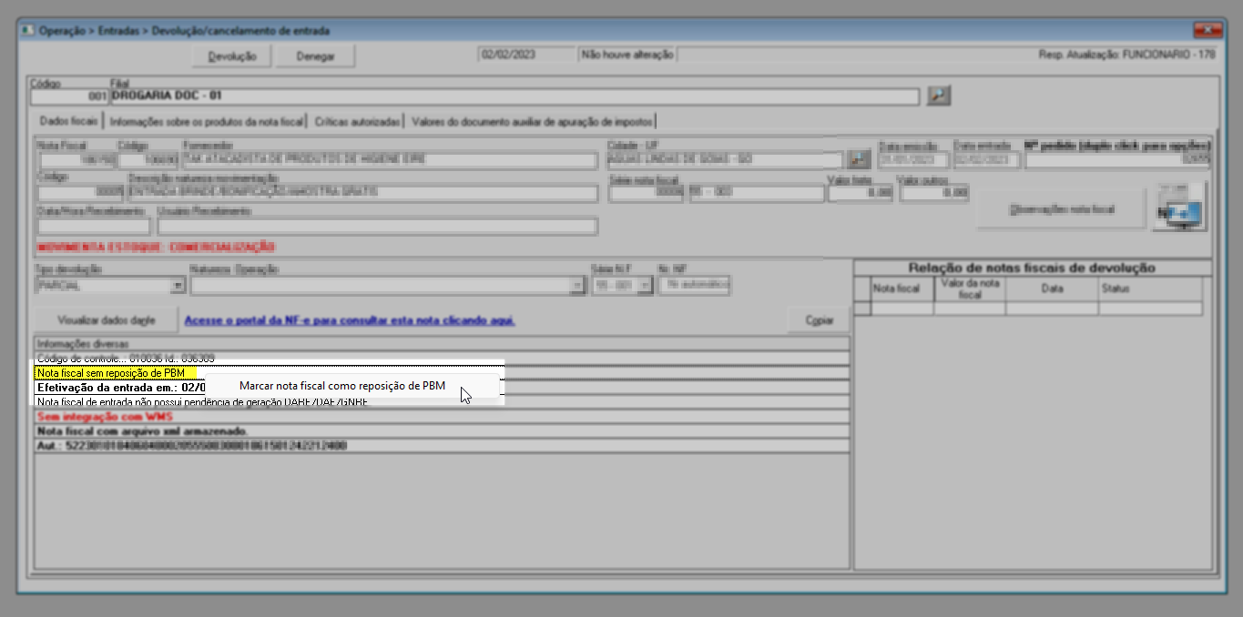 Para realizar esse reprocessamento, após a configuração do item, identifique a nota fiscal e, na seção "Informações diversas", localize a informação "Nota fiscal sem reposição de PBM". Ao acionar o botão direito do mouse sobre a informação, a opção "Marcar nota fiscal com PBM" será revelada, clique sobre ela: