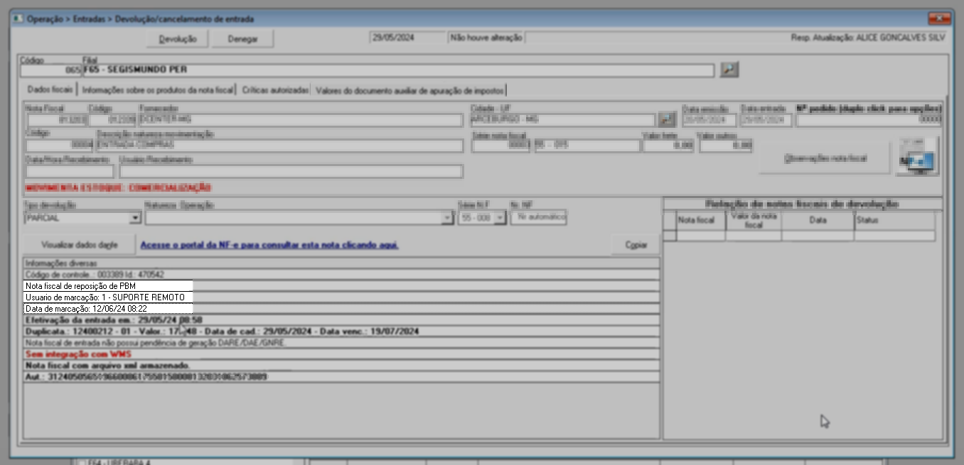 Quando a situação "Nota fiscal sem reposição de PBM" for aplicada, isso indicará que os produtos recebidos no documento não são destinados a essa finalidade. No entanto, caso o usuário identifique que o produto em questão é destinado a reposição PBM e não esteja devidamente configurado, ele poderá realizar a configuração necessária e, em seguida, reprocessar o documento cuja entrada já foi realizada.