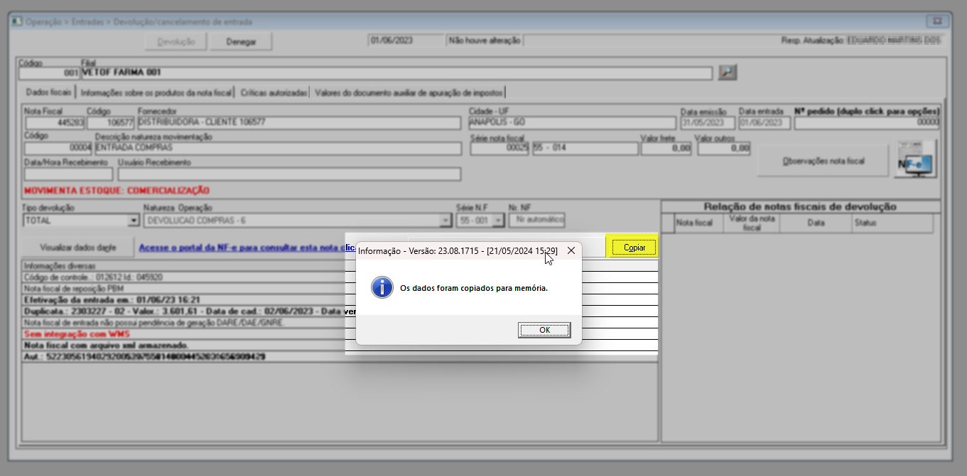 Caso precise, ao lado direito ainda é disponibilizado o botão "Copiar", que copiará todas as informações da seção "Informações Diversas" para a memória do computador, permitindo que posteriormente as cole em outro recurso, como por exemplo o Bloco de Notas e/ou planilha Excel. Clique aqui e saiba mais sobre esse botão. logo, clique em >> "Ok" para encerrar a mensagem: "Os dados foram copiados para memória".