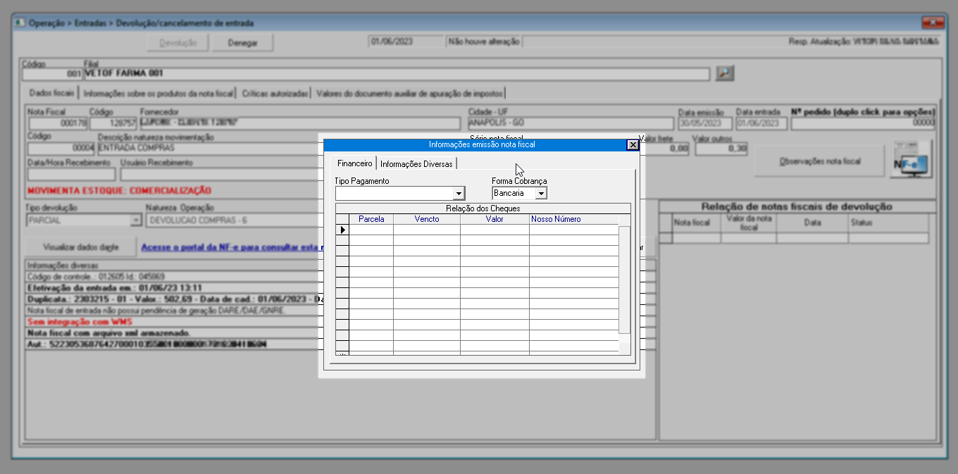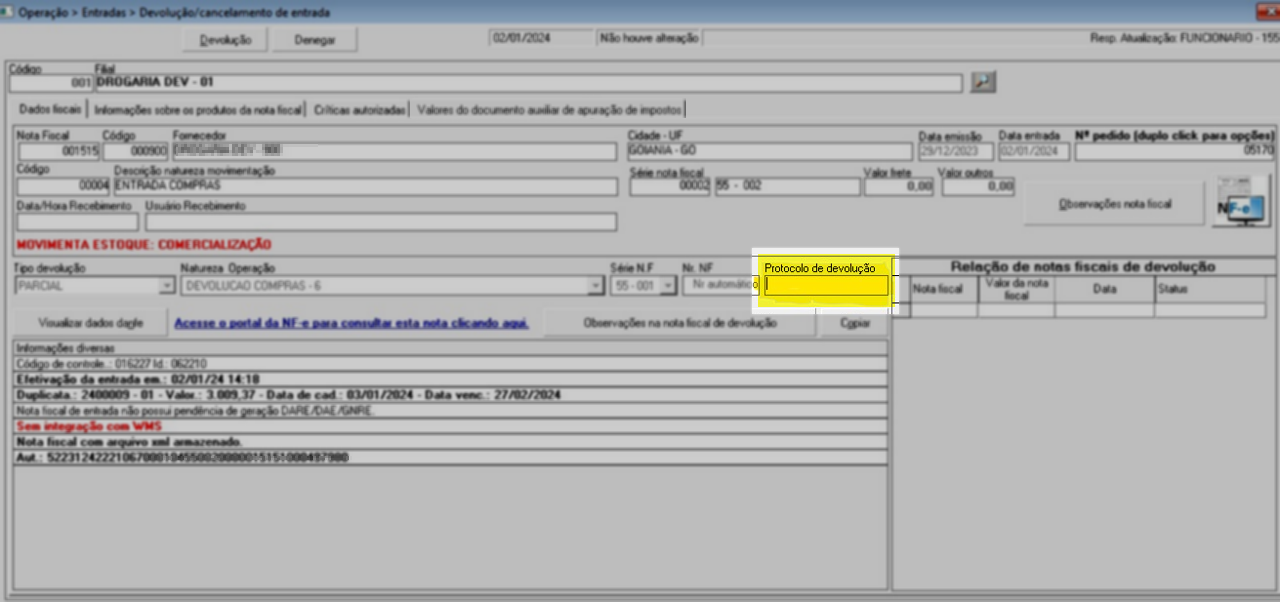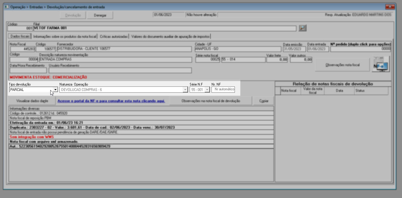 Caso o documento tenha apenas um registro do item, ao clicar em >> Devolução, o sistema aplicará automaticamente a opção "parcial" ao campo - tipo de devolução. Em seguida, à frente será apresentada a operação correspondente à devolução.