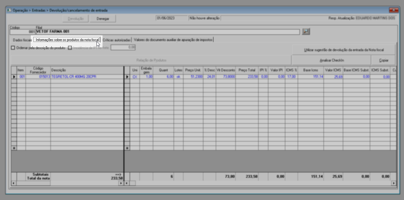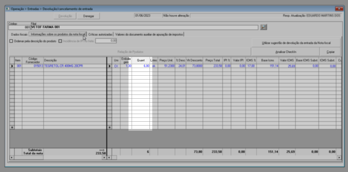 Após a confirmar os itens a serem devolvidos, se necessário, retorne à aba "Informações sobre os produtos da nota fiscal" para visualizar os itens selecionados para devolução. Caso esteja realizando a devolução de um documento com apenas um registro, essa aba apresentará o item a ser devolvido. Dessa forma, o usuário poderá utilizar a coluna "Quant" para revisar e/ou alterar a quantidade a ser devolvida.