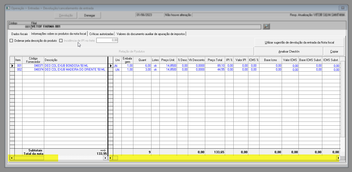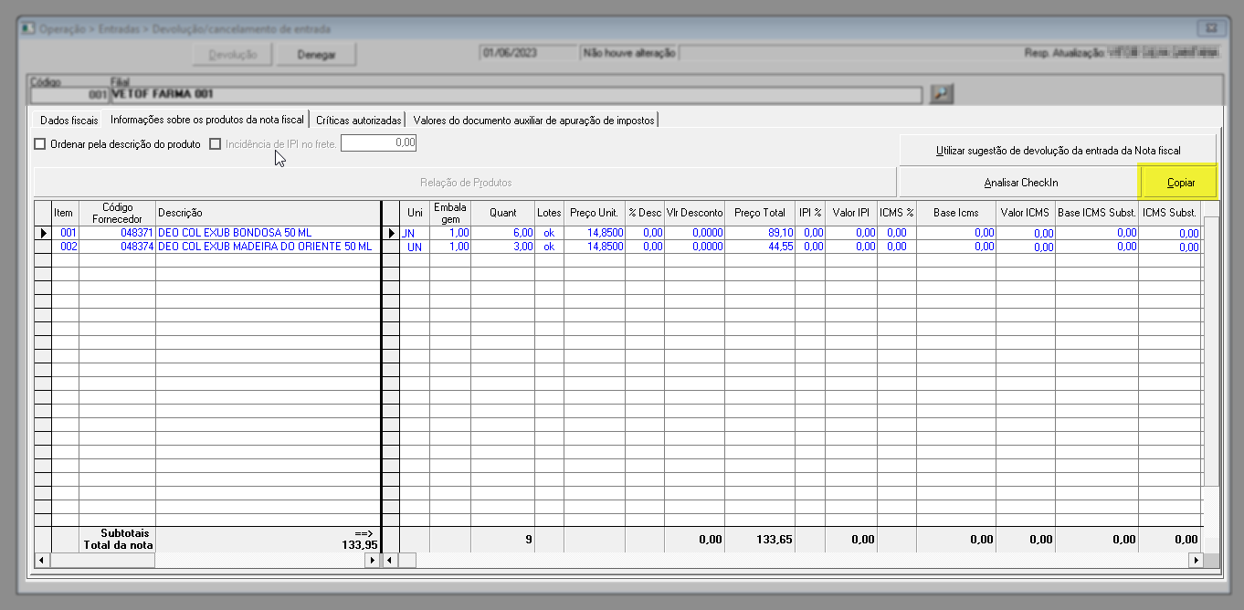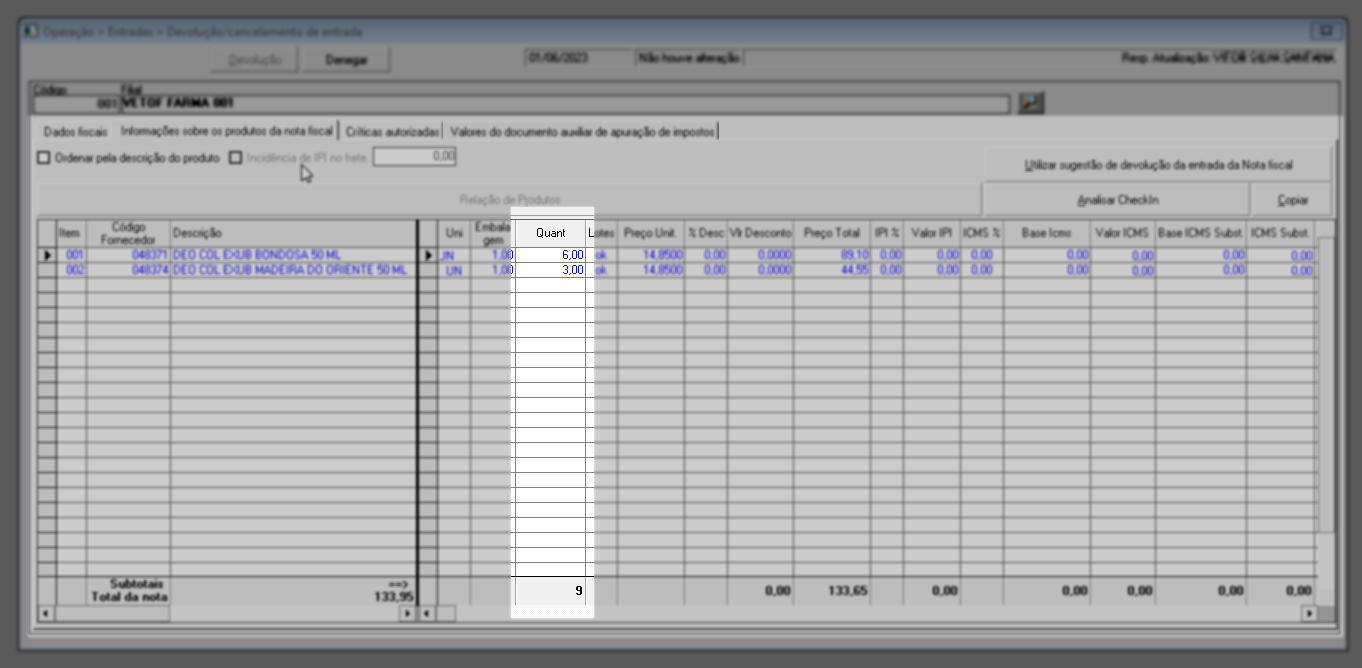 É fundamental compreender que, para que o sistema leve em consideração as quantidades identificadas para devolução, a coluna "Devolver" referente ao produto em questão deve estar marcada. Portanto, é essencial verificar sempre se essa marcação está devidamente feita.