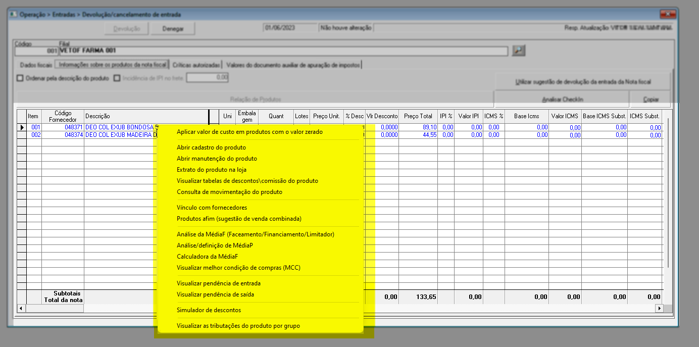 Notas fiscais de natureza: Para produtos de bonificação, doação ou brinde, o custo apresentado é zero, pois são itens fornecidos gratuitamente pelo fornecedor ao cliente como parte de uma promoção ou incentivo. Entretanto, caso a loja queira contabilizar os custos desses produtos, o sistema Vetor permite essa operação.