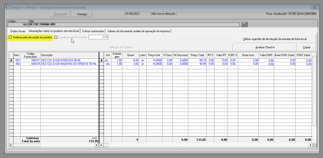 Ainda na aba "Informações sobre os produtos da nota fiscal", o sistema disponibiliza alguns recursos que otimizam a análise dos resultados apresentados na tela, acompanhe a seguir.