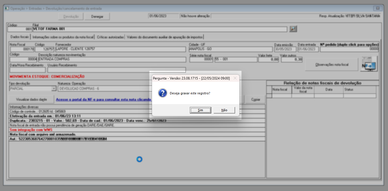 Por fim, será possível gravar a devolução, para isso, tecle o atalho F2 e confirme a mensagem que será exibida.