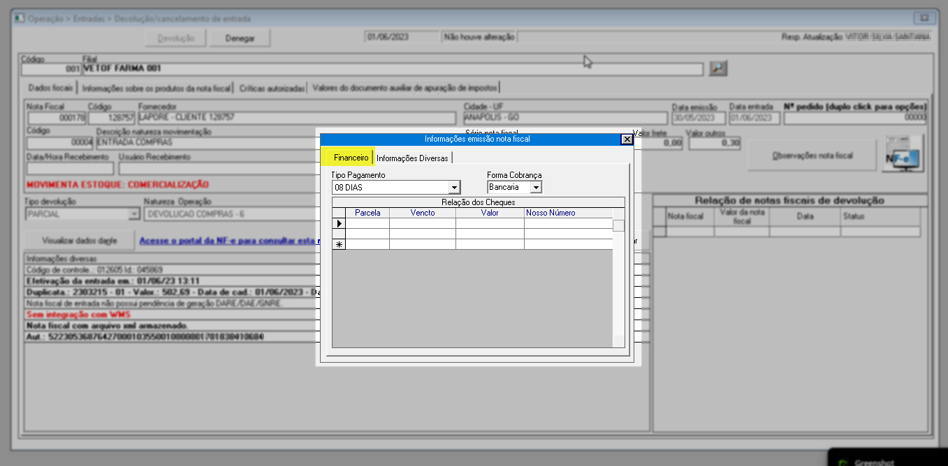 Para operações que envolvem a emissão de uma nota fiscal de devolução de compras, o usuário tem a opção de realizar o cancelamento com base em dois cenários distintos. Primeiramente, é possível cancelar o documento caso seja realizado dentro do prazo aceito pelo estado emissor. Em segundo lugar, em alguns Estados é possível realizar um cancelamento extemporâneo para documentos específicos após o prazo legal, neste caso, é aconselhável consultar a sua contabilidade antes de iniciar essa operação. Portanto, ao realizar o cancelamento, a mercadoria será devolvida ao estoque, e um estorno financeiro correspondente será gerado para refletir essa operação