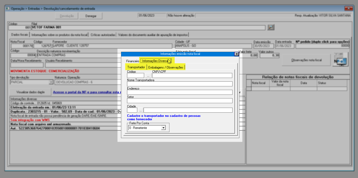 Na aba seguinte "Informações diversas", são disponibilizadas outras duas abas. A aba "Transportador" é destinada à inserção dos dados do transportador responsável pela logística da mercadoria. E a aba "Embalagem/Observações" disponibiliza os campos adequados para registro das informações acerca da embalagem dos itens e o campo para registro de observações relativas à devolução em questão. Informe e feche a tela.