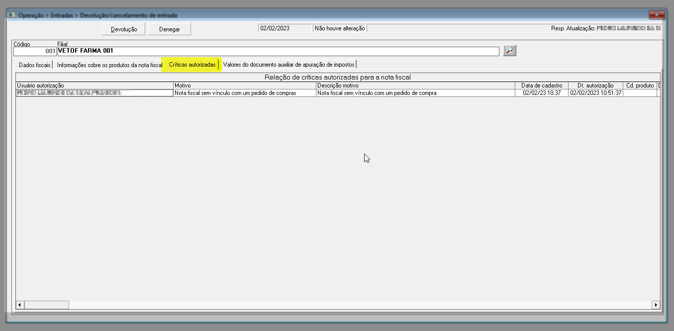 Ao lado, na aba "Críticas Autorizadas", não deixe de conferir os detalhes das críticas e/ou advertências que foram autorizadas pelo usuário na entrada da nota fiscal específica. Essas críticas têm o propósito de alertar o usuário sobre problemas relacionados ao documento. É detalhado na seção "Relação de críticas autorizadas para a nota fiscal" o nome do usuário que autorizou a ação, motivo da crítica, sua descrição, entre outros dados correspondentes.