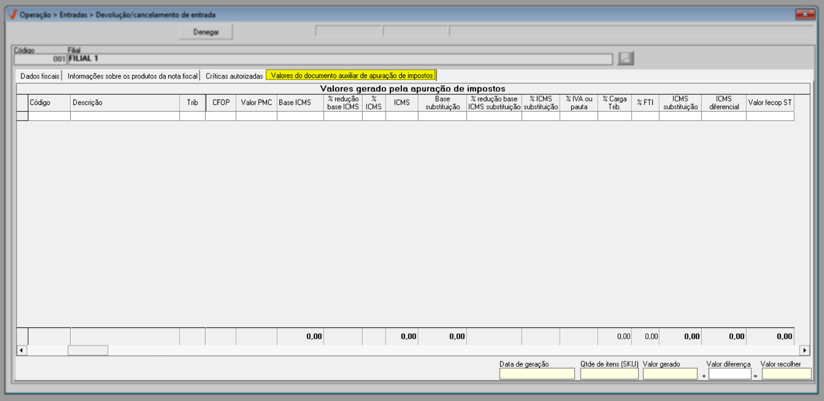 A aba "Valores do documento auxiliar de apuração de impostos" exibirá o histórico de registros dos valores gerados para os produtos durante a apuração de impostos, sempre que houver informações disponíveis.